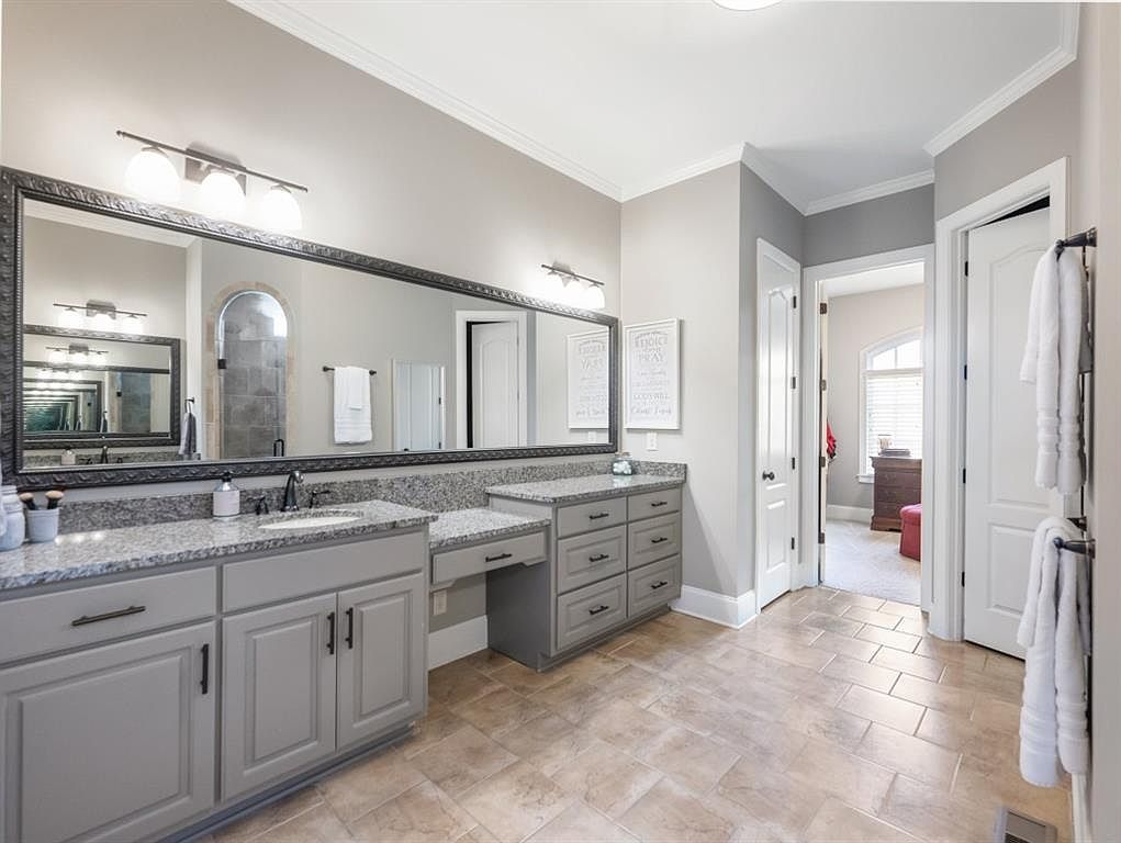 This bathroom features an expansive dual-sink vanity with granite countertops and light grey cabinetry providing ample storage. A large ornate framed mirror stretches across the wall above the vanity, reflecting light from the three-bulb vanity lights above. The floor is tiled in a warm beige tone, complementing the soft neutral wall color and white crown molding. To the side, a built-in makeup or sitting area is integrated into the cabinetry. White doors lead to adjacent rooms, and neatly hung white towels on black metal racks add a clean, polished look to the space. The overall design balances functionality and elegance with a soothing, modern color palette.