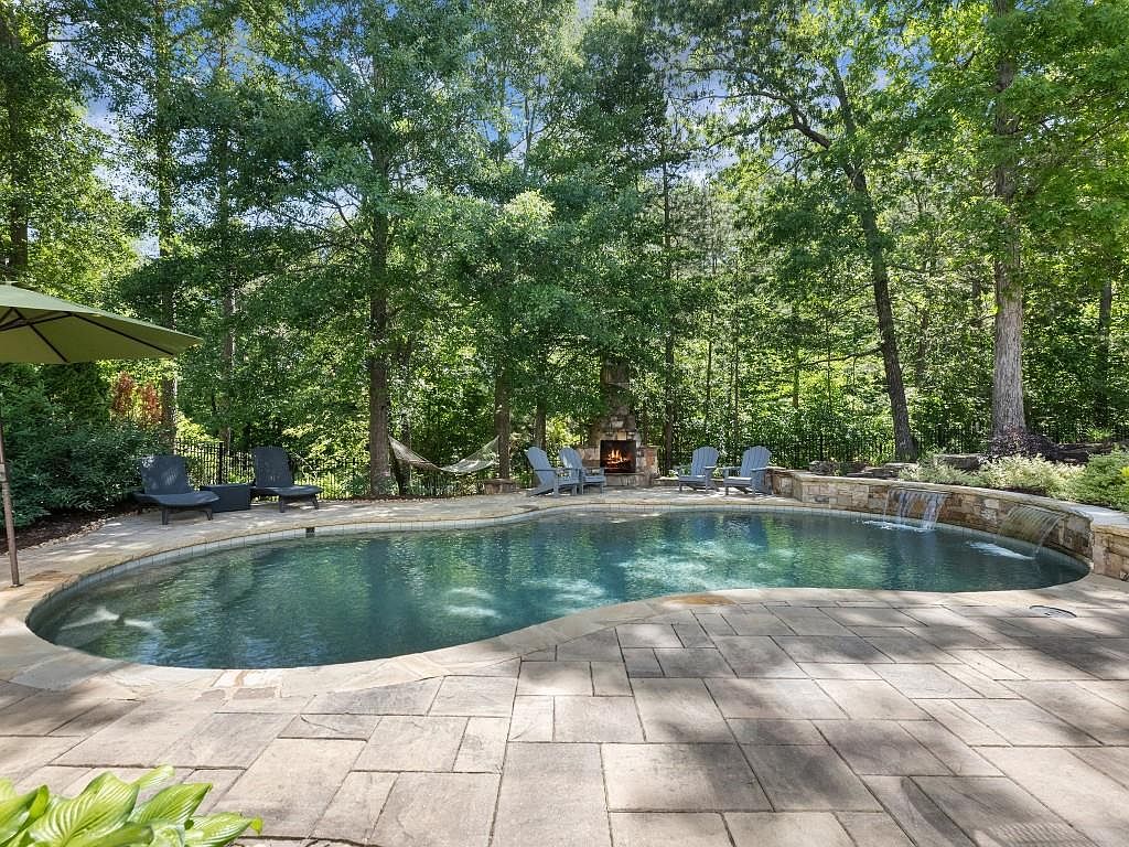 This serene backyard space centers around a kidney-shaped swimming pool with clean, smooth stone edging. Surrounding the pool is a spacious patio paved with light gray stone tiles arranged in a subtle geometric pattern, offering ample space for lounging and entertaining. Comfortable dark-colored lounge chairs and Adirondack seats face a rustic stone outdoor fireplace, adding warmth and a cozy gathering spot. The stone wall along one edge of the pool houses two gentle water features that create a relaxing ambiance. Towering mature trees and lush greenery provide natural shade, privacy, and a tranquil forest-like backdrop.