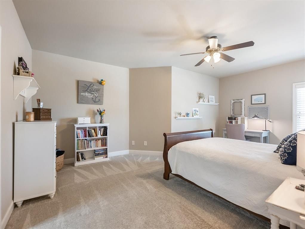 This serene bedroom corner showcases a tasteful blend of comfort and functionality. The walls are painted in soft beige tones paired with clean white trim that complements the neutral carpeting featuring fresh vacuum lines. A dark wooden sleigh bed with white bedding anchors the space, while a white dresser and small bookshelf provide ample storage and display options. Two white floating shelves above the bookcase hold decorative items and photos, adding a personal touch. A compact white desk with a modern chair and task lamp completes the corner, perfect for study or work. The ceiling fan with light fixture provides gentle illumination and airflow, enhancing the room’s inviting ambiance.