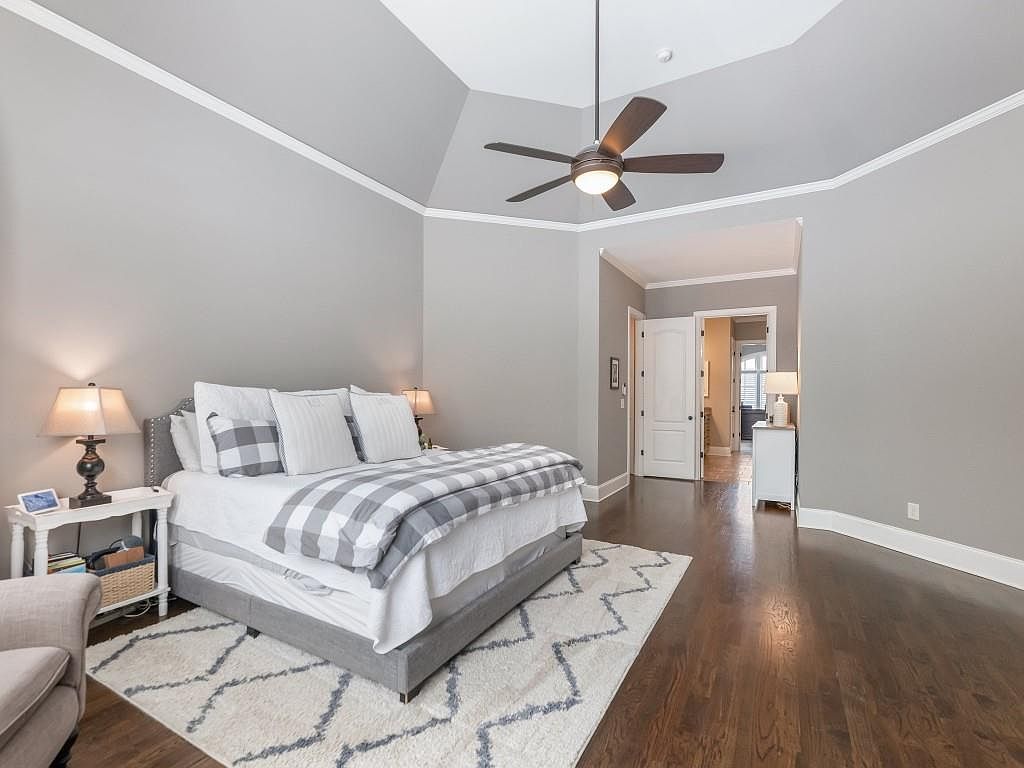 The spacious master bedroom features a high vaulted ceiling painted in a soft gray, paired with matching walls that exude calm and sophistication. A modern ceiling fan with dark wood blades centers the room, adding both function and style. The king-sized bed is dressed in white and gray buffalo check bedding, sitting atop a cream area rug with a subtle zigzag pattern that contrasts against the rich, dark hardwood flooring. On either side of the bed, classic bedside tables hold traditional lamps emitting a cozy glow. The doorway leads to an adjoining hallway or bathroom, framing the room’s open and airy layout.