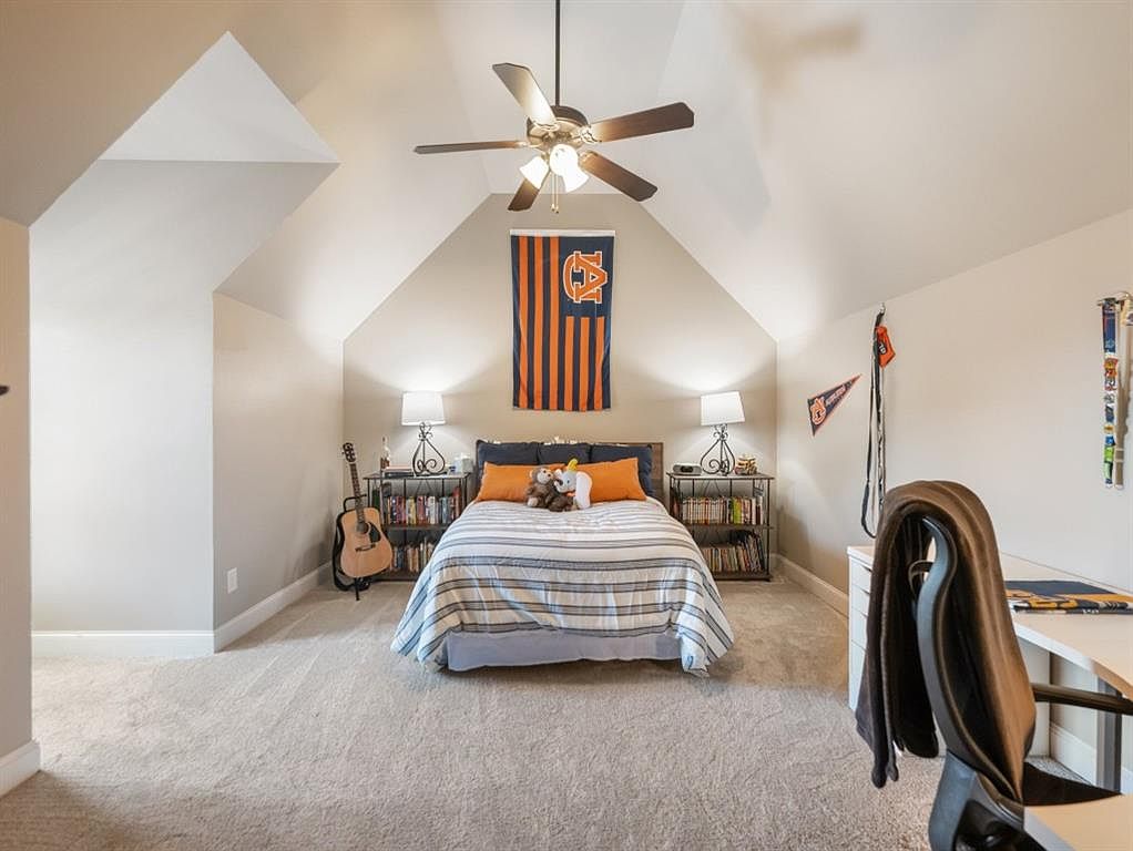 This bedroom corner features a vaulted ceiling with soft beige walls and plush neutral carpeting that adds warmth. A full bed, adorned with striped bedding and orange accent pillows, anchors the space. Two matching bedside tables with ornate lamps flank the bed, providing balanced illumination. A guitar leans casually against the left wall, suggesting a relaxing creative vibe. Auburn University colors and memorabilia, including a wall banner and pennant, lend a sporty, personal touch. A white desk and black office chair occupy the right side, integrating work or study functionality into the restful ambiance.