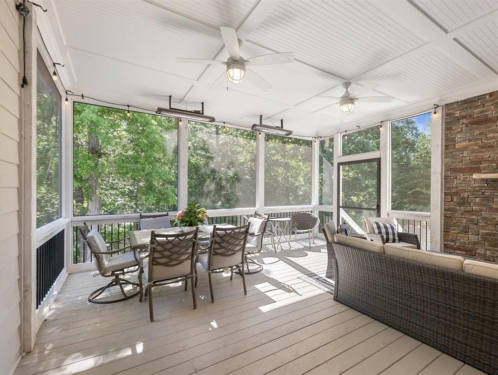 This screened porch offers a relaxed and airy atmosphere surrounded by lush greenery visible through large mesh screens. The space features a light gray wooden floor and white paneled ceiling with two ceiling fans and industrial-style light fixtures, promoting comfort and ventilation. Furniture includes a rectangular dining table with six cushioned metal chairs arranged for social meals, complemented by a woven rattan sofa adorned with striped cushions for casual lounging. A stone accent wall adds warmth and texture, while small side tables and string lights contribute charming details to complete this inviting outdoor retreat.