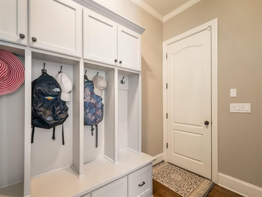 This entryway area features a built-in cubby storage system with white panel cabinets and functional hooks designed for hanging backpacks and hats. The cabinetry is tall, with upper storage compartments closed off by doors, and lower bench-style seating with drawer storage beneath. Walls are painted in a soft beige tone, complementing the crisp white trim and cabinetry. The floor features medium-toned hardwood with a decorative, earth-toned rug positioned in front of the white door, which has a raised panel design. This space blends practicality with a clean, classic aesthetic perfect for organizing daily essentials at the home’s entrance.