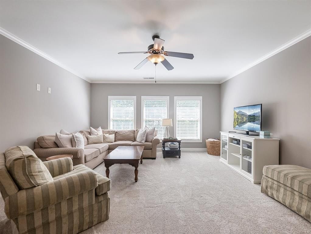 This spacious living area features a soft neutral color palette with light gray walls and plush beige carpeting, creating a calm and inviting atmosphere. The layout centers on a large, comfortable beige sectional sofa accented with multiple coordinating throw pillows. Complementing this, two striped armchairs with muted earth tones frame the seating arrangement, fostering a cozy gathering space. Natural light streams through three windows dressed in white blinds, enhancing the room’s brightness. A dark wooden coffee table and side table add warmth and contrast, while a white media cabinet houses a TV, completing the space with functional, understated charm. A ceiling fan with lights provides both airflow and illumination.