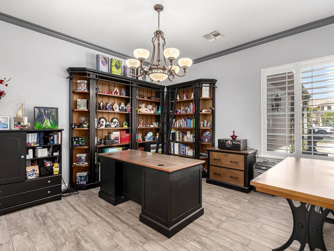 This cozy home office features a cohesive blend of black and natural wood tones. The focal point is a spacious wooden desk with a black base and natural wood tabletop, positioned centrally on a light grey wood-look tile floor. A commanding L-shaped black bookcase with wooden interiors lines the corner, filled with books, collectibles, and decorative items, adding personality to the space. A smaller black and wood storage cabinet sits beneath a window with white plantation shutters, bringing in natural daylight. Soft grey walls with matching crown molding complement the chandelier with warm-toned glass shades, creating an inviting workspace full of charm and functional elegance.