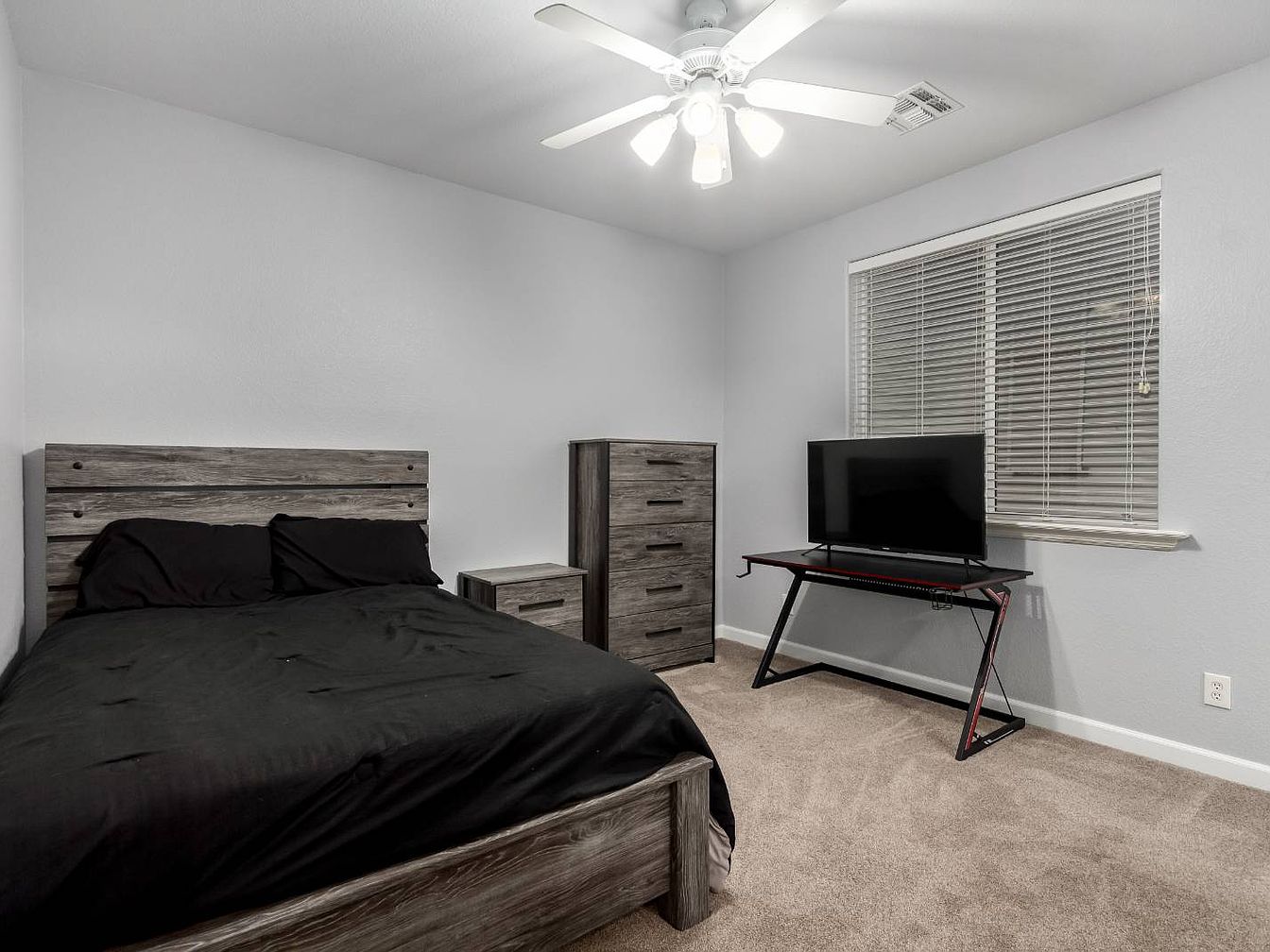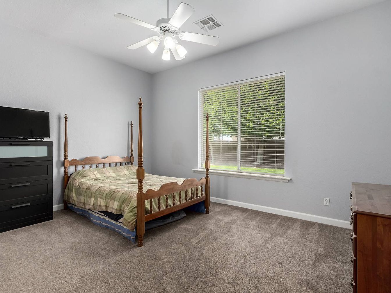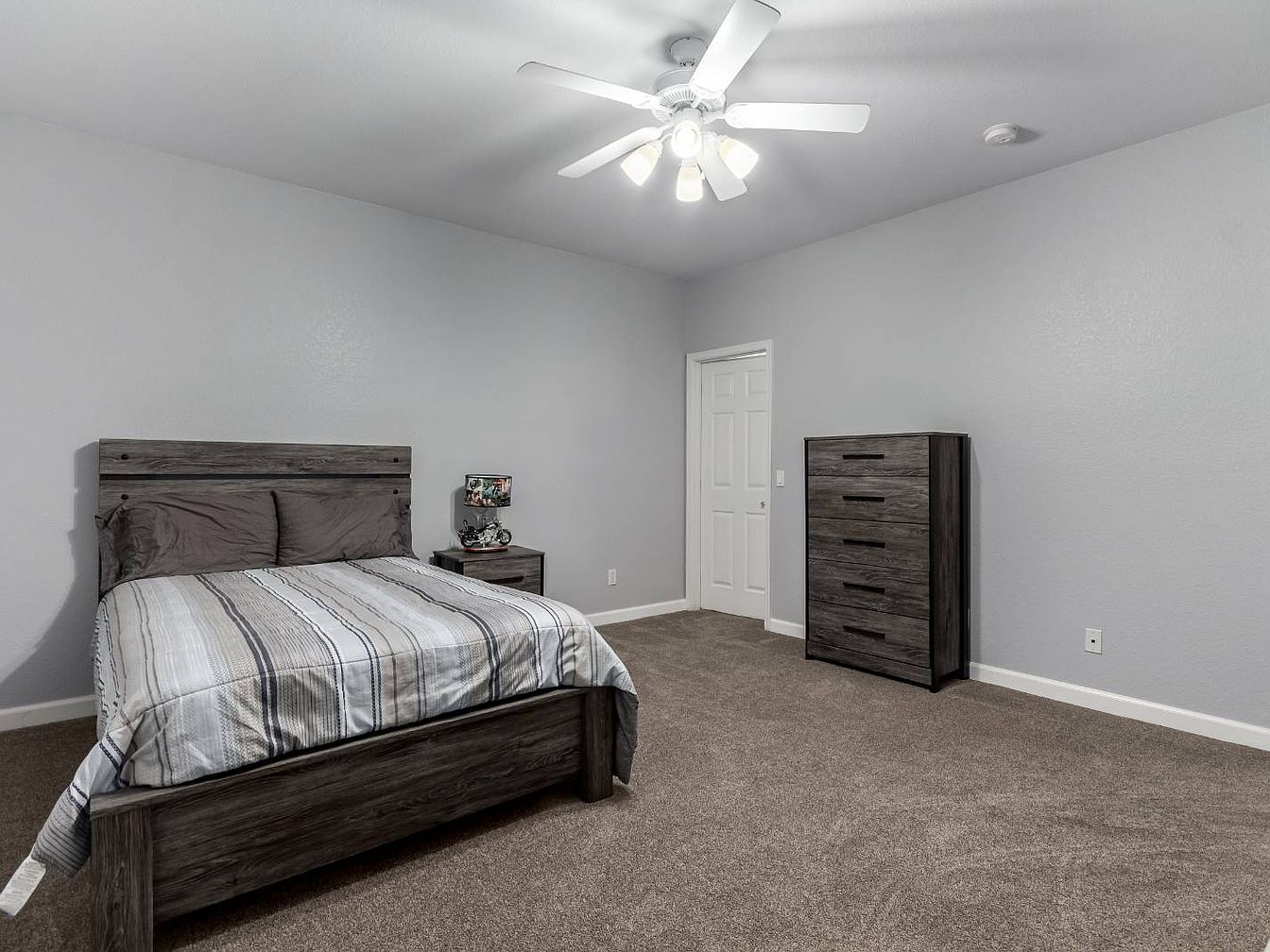 This bedroom features a simple, cozy layout with a four-poster wooden bed positioned near a large window that allows natural light to brighten the space. The walls are painted a soft, neutral gray, creating a calm and serene atmosphere, complemented by the plush, light brown carpet underfoot. Furniture includes a tall black dresser with a small TV on top and a classic wooden chest of drawers, providing ample storage with understated elegance. Above, a white ceiling fan with multiple lights adds both functionality and subtle charm to the room’s clean, minimalist aesthetic.