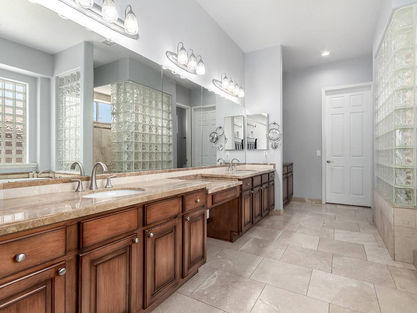 This spacious bathroom features a double vanity with elegant wooden cabinetry finished in a warm, rich tone. The countertops are smooth and polished stone, complementing the cabinetry with a slightly lighter hue. Large mirrors extend across the length of the vanity, enhancing the sense of openness and reflecting the soft lighting from multiple fixtures above. The floor is tiled with large, light-colored stone tiles, adding a natural, clean look. Glass block walls provide partial separation to the shower area, letting in natural light while maintaining privacy. The overall design blends classic and contemporary elements with a neutral color palette emphasizing warmth and brightness.