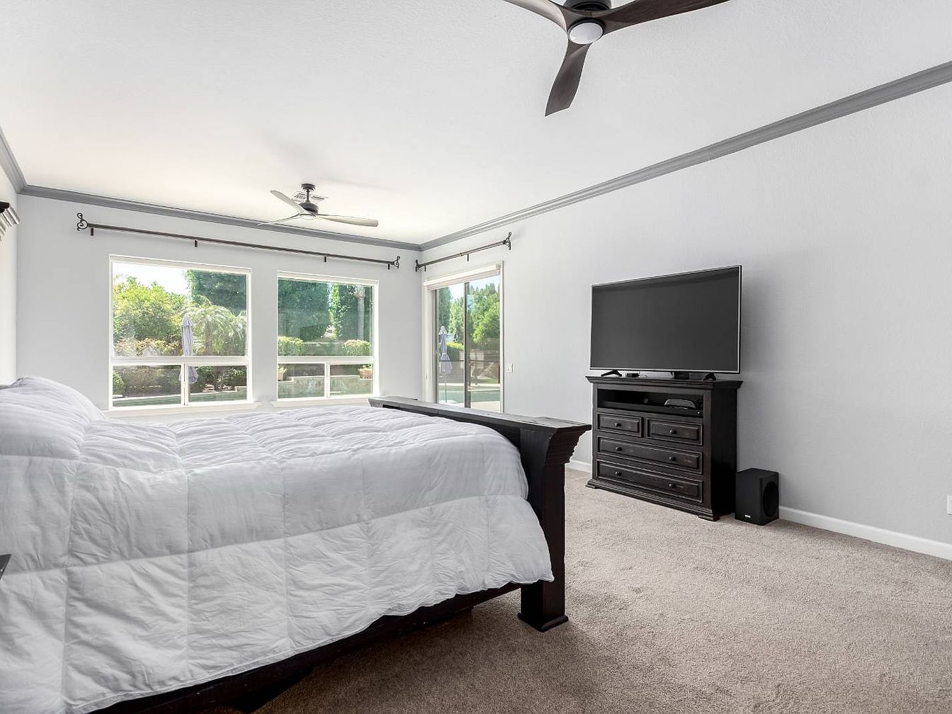 This master bedroom features a calming palette with soft gray walls contrasted by white trim and ceilings, lending a tranquil atmosphere. The room is centered around a dark wood bed frame topped with a crisp white comforter, adding a clean, modern touch. Two large windows and a sliding glass door draw in natural light and offer serene views of lush greenery and a pool area outside. Two sleek ceiling fans with contemporary design help maintain air circulation. Opposite the bed, a dark wood dresser supports a flat-screen TV, enhancing relaxation and entertainment options.