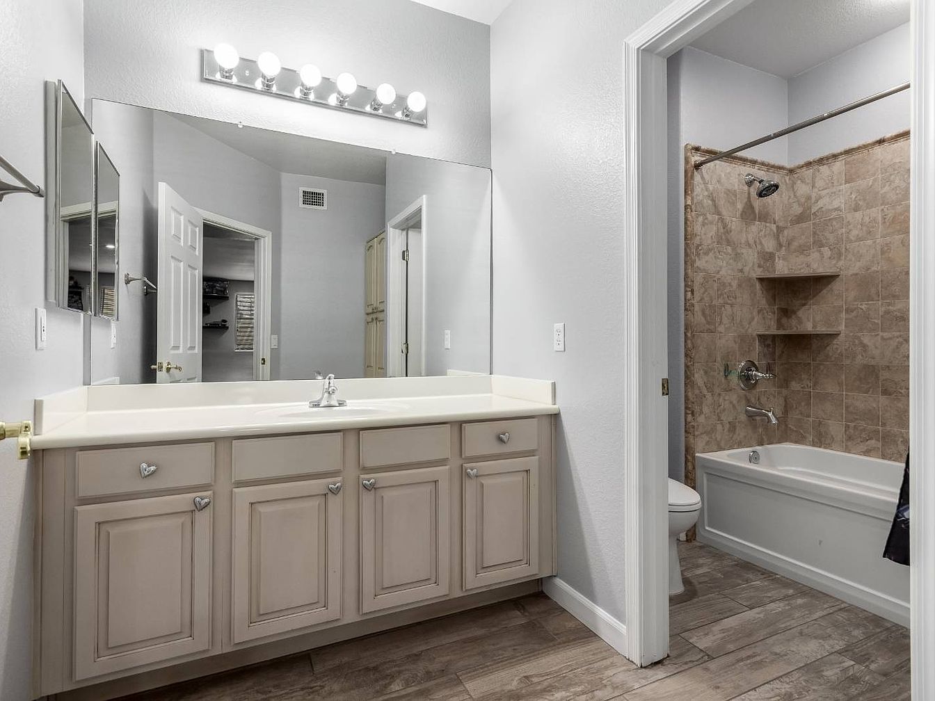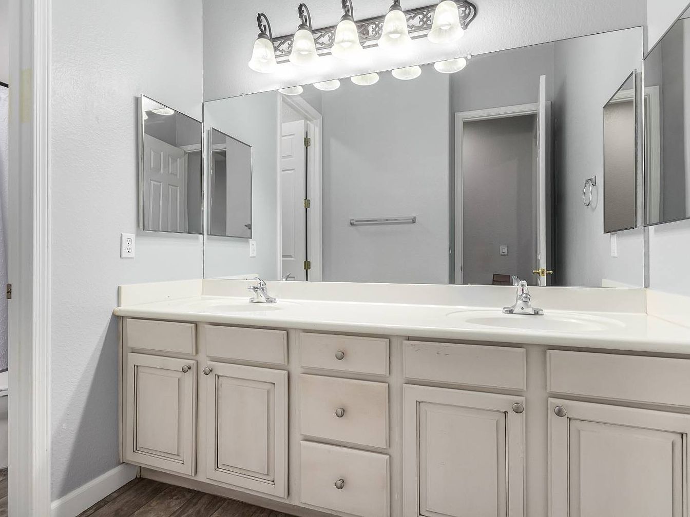 This bathroom features a spacious double-sink vanity with a long, white countertop and cream-colored cabinetry accented by simple round knobs. Above the sinks, a large mirror stretches across the wall, enhancing the room’s openness and brightness, complemented by a row of five decorative lights with frosted glass shades. The walls are painted soft gray, creating a calming atmosphere, while the dark wood-look flooring adds warmth and texture to the space. Adjacent doors and towel fixtures suggest the vanity area is central to this well-designed, functional bathroom.