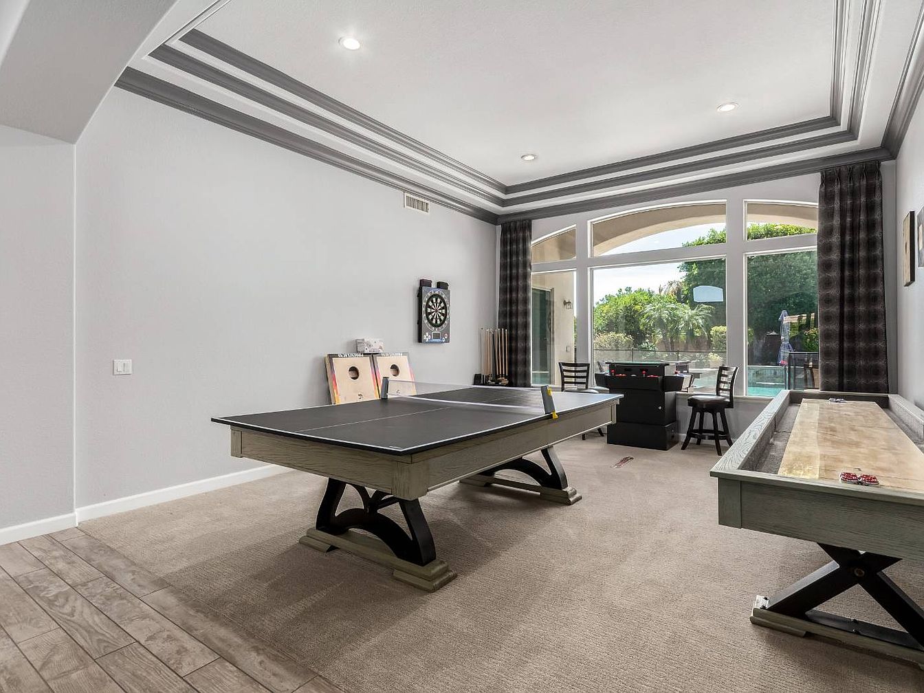 This spacious game room features a soft beige carpet that contrasts with the light gray walls and elaborate tray ceiling accented by darker moldings. At its center, a multi-purpose gaming table serves as a ping pong setup, accompanied by a shuffleboard table to the right. A dartboard hangs on one wall, with additional games like a foosball table positioned by large, arched windows that offer a scenic view of the backyard pool and greenery. Dark patterned curtains frame the windows, adding depth to the otherwise neutral, modern, and inviting entertainment space.