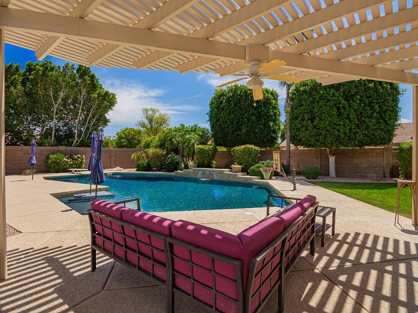 A spacious backyard patio features a large swimming pool surrounded by a light-colored concrete deck, creating a clean and bright outdoor living space. A pergola with open slats provides partial shade, casting striking striped shadows on the patio. Beneath it, a modern outdoor sectional with plum-colored cushions offers comfortable seating, enhancing the inviting atmosphere. Lush landscaping, including sculpted hedges and various green trees along a brick privacy wall, frames the pool area. A ceiling fan under the pergola ensures comfort on warm days, while poolside umbrellas are available for additional shade, blending relaxation and style seamlessly.