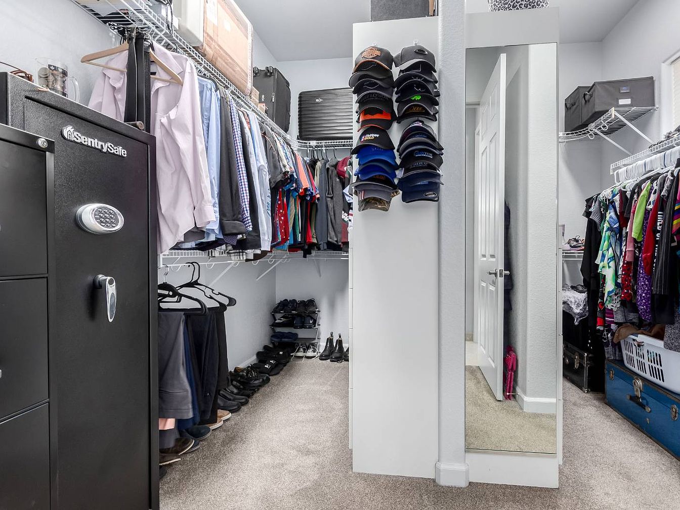 This spacious walk-in closet features a neutral color palette, primarily soft greys and whites, complemented by beige carpeting that adds warmth underfoot. The layout is efficiently designed with wire shelving lining both sides, providing ample hanging space for shirts, jackets, and dresses. Below the hanging clothes, several pairs of shoes are neatly arranged, optimizing floor use. A black SentrySafe is positioned on the left, adding a security element to the space. A tall mirror mounted on a central dividing column creates a sense of depth and provides functionality. Hats are displayed on wall-mounted racks, adding a unique personal touch to the organized and practical setup.