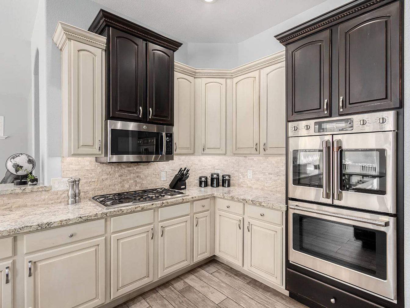This kitchen corner blends classic elegance with modern functionality. The cabinetry displays an attractive two-tone finish, with cream-colored lower and corner cabinets contrasting against dark wood upper cabinets on either side, lending depth and sophistication. Stainless steel appliances, including a built-in microwave above a gas stove and double ovens, enhance the contemporary feel while providing efficient cooking options. A light, textured stone backsplash extends across the walls, complementing the granite countertops’ subtle pattern. Wide plank, gray-toned flooring adds warmth and ties the whole space together, highlighting the clean lines and detailed crown molding along the cabinet tops.
