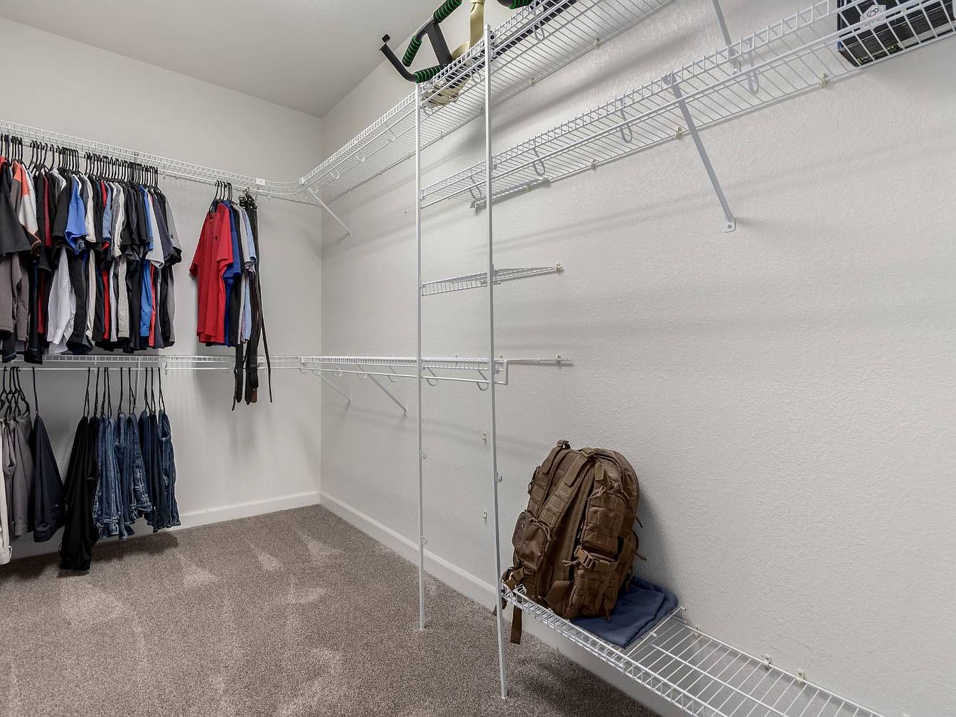 This spacious walk-in closet features a practical layout with white wire shelving running along two adjacent walls, maximizing storage capacity. The closet boasts a clean, neutral color scheme with soft gray carpeting and pale walls, creating a light and airy atmosphere. Variety of hanging clothes, including shirts, pants, and belts, are neatly organized on hangers, highlighting the ease of access and effective use of vertical space. A brown backpack rests on one of the lower shelves, adding a simple, lived-in touch. The design balances functionality with minimalism, suitable for maintaining a clutter-free environment.