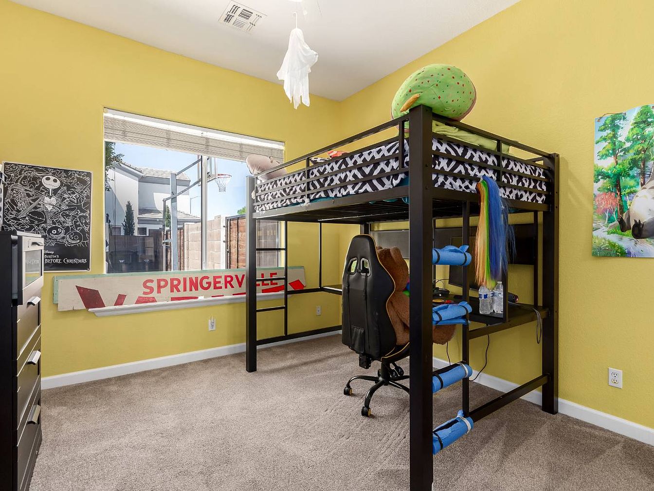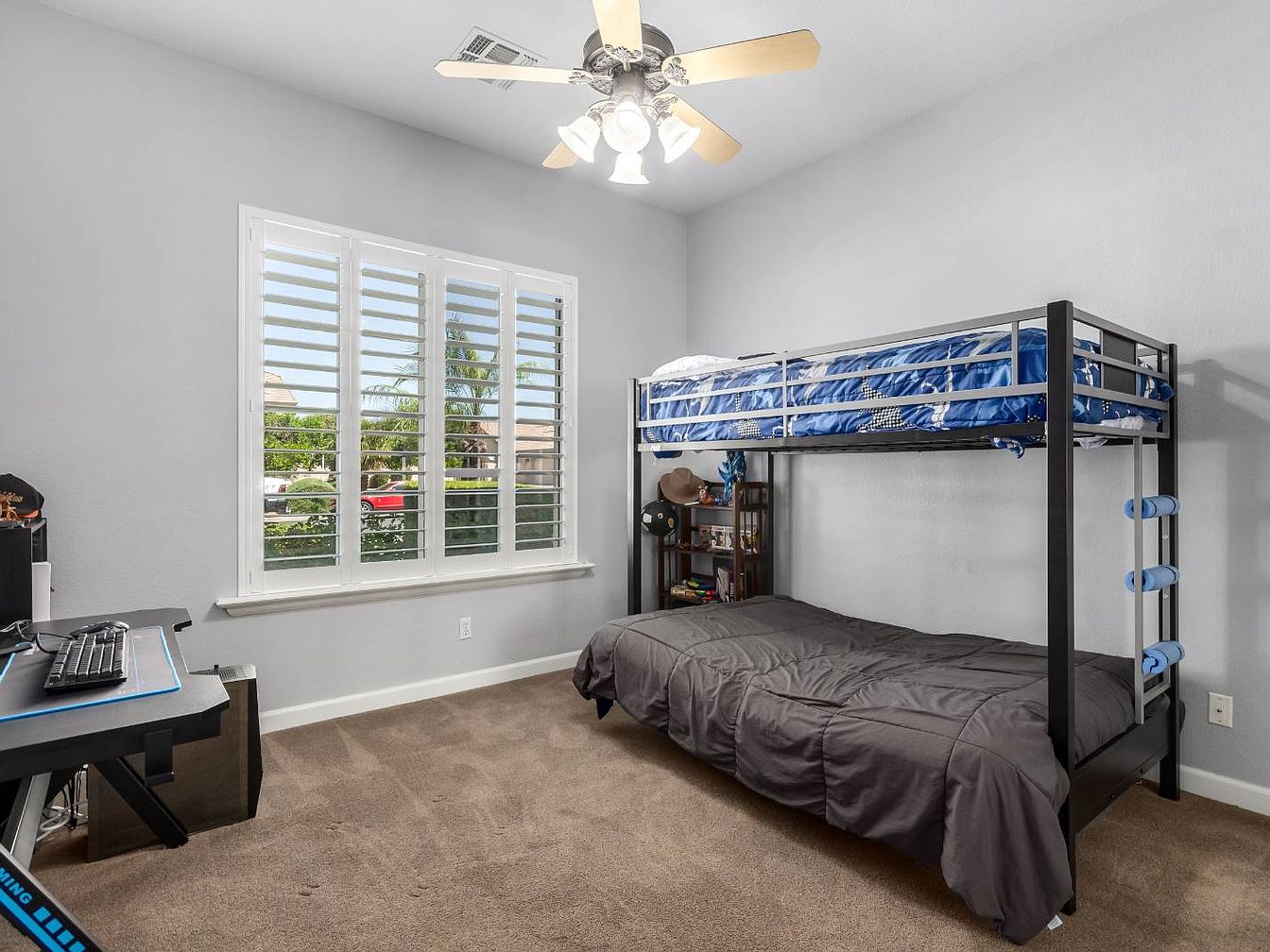 This bedroom is designed for functionality with a modern, minimalist aesthetic. A black metal bunk bed occupies the right side, featuring a twin bed on top with blue bedding accented by white patterns, and a larger bottom bed with neutral dark gray bedding. The walls are painted in a crisp light gray, enhancing the room’s airy and calm atmosphere. A window with white plantation shutters lets in ample natural light, framed by a simple white trim. The beige carpet adds warmth and softness underfoot. A ceiling fan with light fixtures provides ceiling lighting and airflow. A small desk with a computer is positioned near the window, offering a dedicated workspace. The overall design blends practicality with subtle neutral tones suitable for a child or teenager’s room.