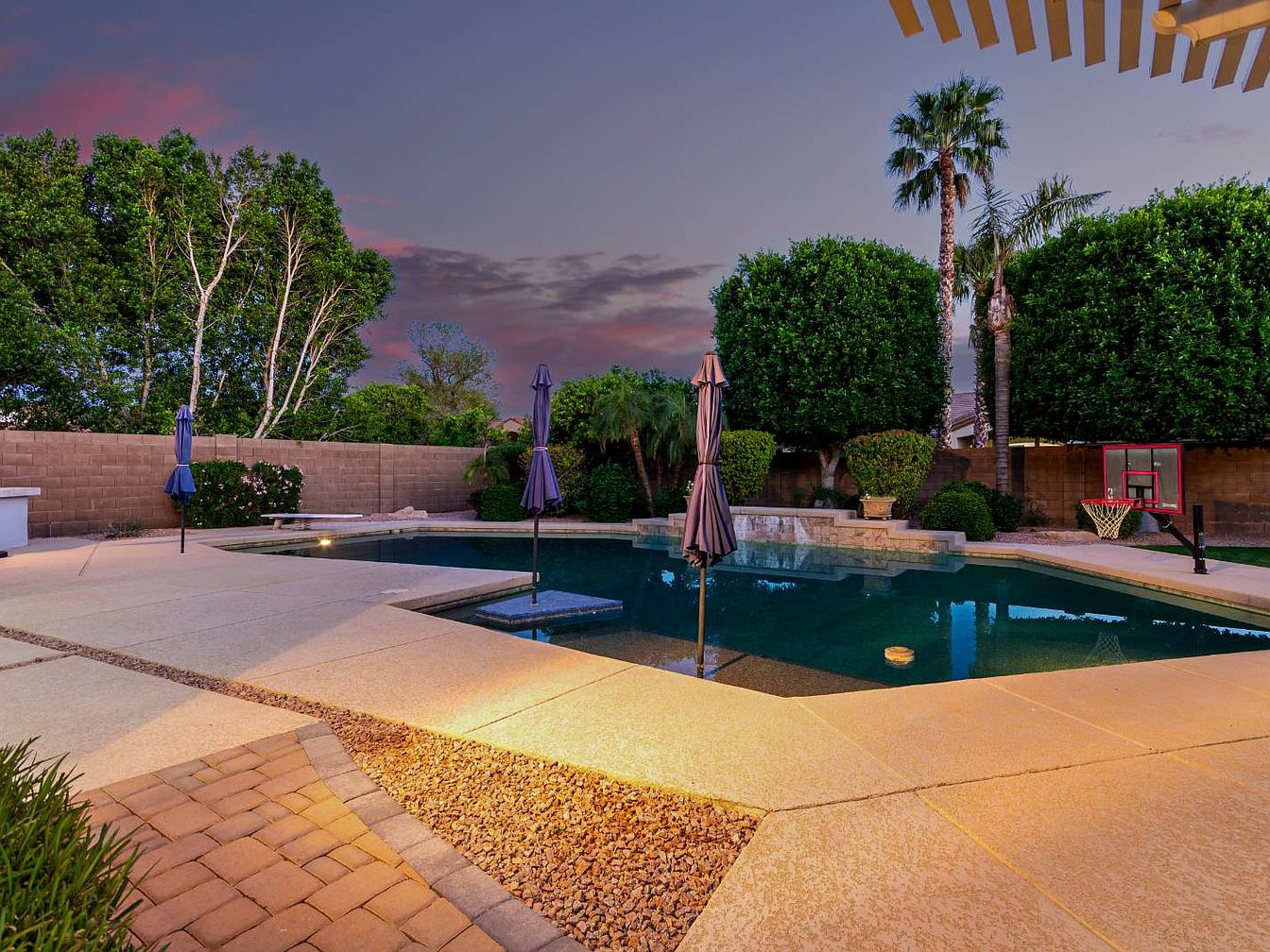 This outdoor space centers around a spacious, freeform swimming pool, bordered by light-colored concrete decking that contrasts nicely with the shimmering water. Around the pool, multiple closed patio umbrellas stand on raised platforms, suggesting a comfortable lounging area when open. The perimeter is framed by a privacy brick wall and mature landscaping, including neatly trimmed shrubs, palm trees, and other lush greenery, creating a serene and inviting environment. The subtle lighting enhances the ambiance as twilight falls, making this backyard a perfect blend of functionality and relaxation for social gatherings or peaceful evenings.
