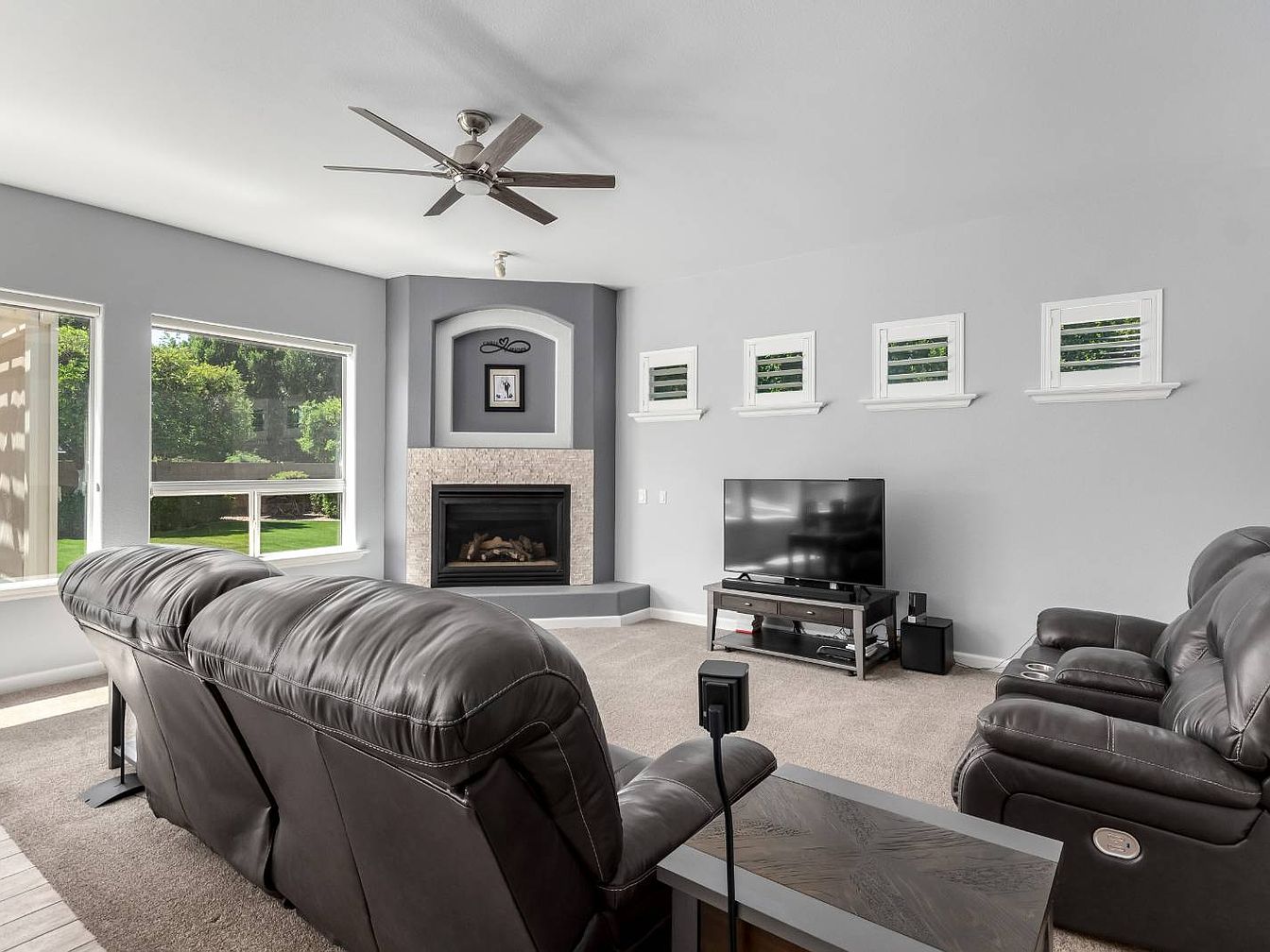This living room features a cozy yet modern design with soft gray walls creating a calming atmosphere. A fireplace sits elegantly in the corner, framed by light stone tiles and bordered with a darker gray accent wall niche that holds a small decorative piece. The room is furnished with black leather recliners arranged to face a flat-screen TV on a dark wood stand, promoting relaxation and entertainment. Above the TV, four small, white-framed windows with plantation shutters add architectural interest and natural light. A silver ceiling fan complements the neutral color scheme and adds contemporary flair.