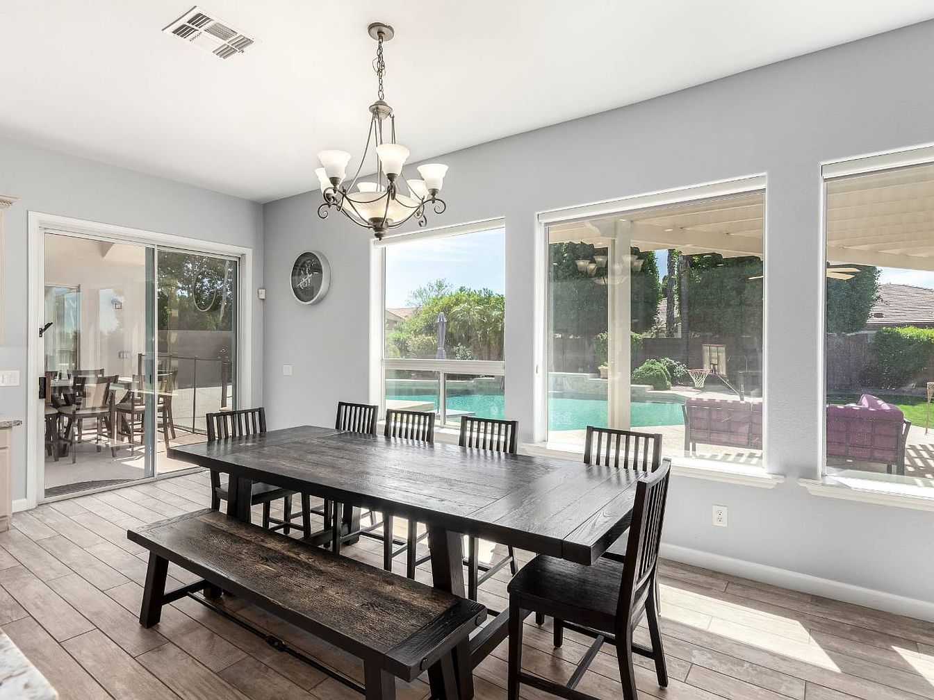 This dining area features a spacious, rectangular dark wood table paired with matching chairs and a bench, creating a balanced mix of traditional and rustic aesthetics. The light gray walls enhance the natural light streaming through three large windows, which offer an inviting view of the outdoor pool and patio area. The wooden floor tiles add texture and warmth, while a classic chandelier with several frosted glass shades hangs centered above the table. Sliding glass doors lead to an additional outdoor seating area, seamlessly connecting indoor and outdoor living spaces in this bright, casual dining corner.