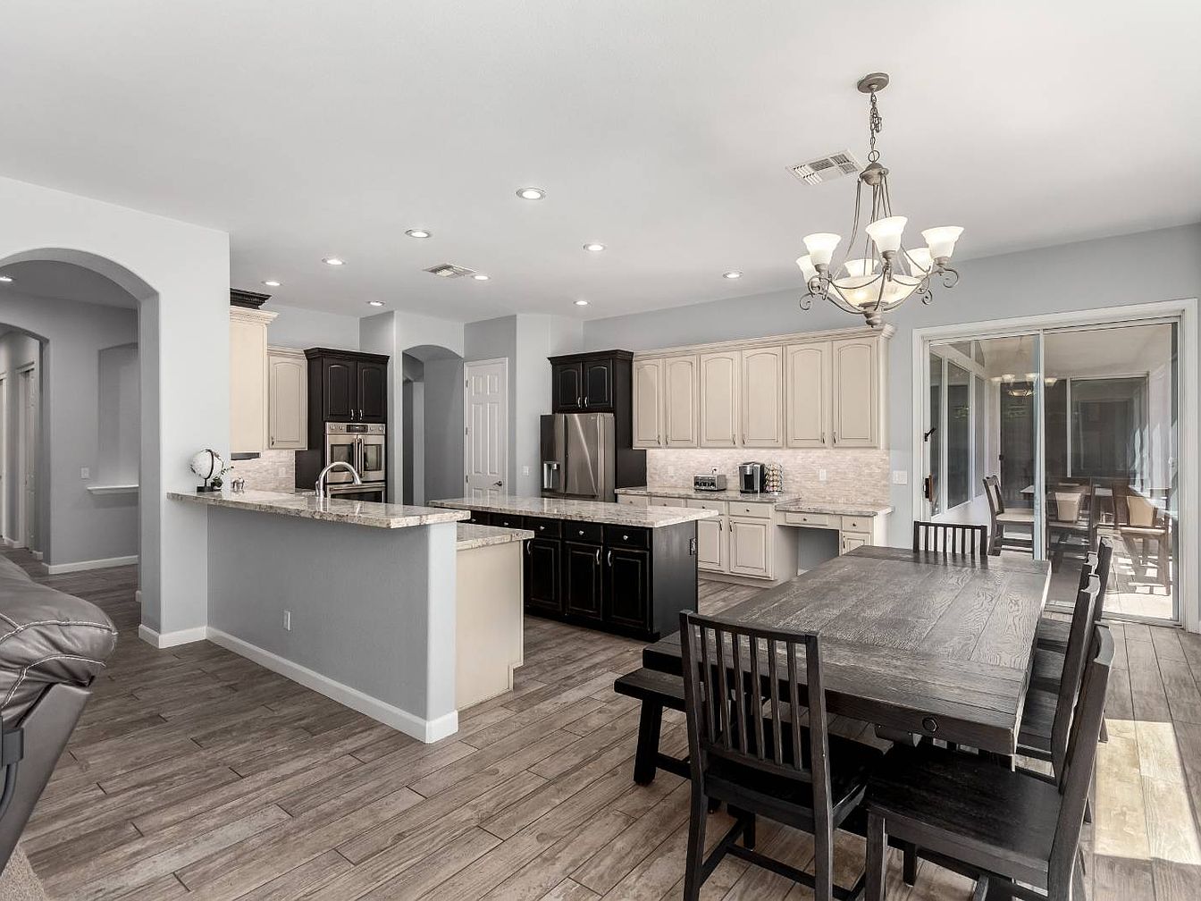 This open-concept kitchen and dining space features a modern and neutral color palette dominated by soft grays and black accents. The kitchen cabinets are a mix of creamy off-white and matte black, creating a balanced contrast. countertops are light granite, which complements the tile flooring that mimics natural wood planks, adding warmth to the space. The kitchen island doubles as a prep area with cabinets underneath, while a raised bar counter adds casual seating options. A large, rustic dark wood dining table with matching chairs fills the adjacent dining area, illuminated by a classic chandelier. Ample recessed lighting and natural light streaming through sliding glass doors enhance the bright, airy atmosphere. The doors open to a well-lit outdoor space, further extending the living area visually and functionally.