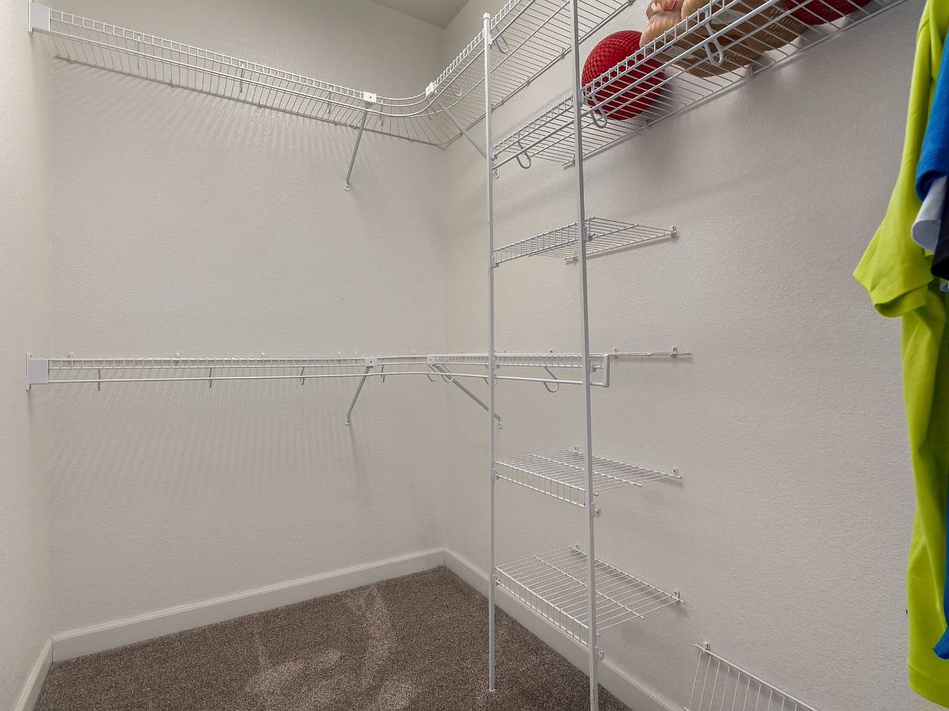 This walk-in closet offers a clean, utilitarian design focused on maximizing storage capacity. White wire shelving lines the walls, providing ample space for hanging clothes and organizing folded items or accessories. The open wire design maintains airflow, while the neutral beige carpeting adds warmth and a soft underfoot feel. The walls are painted in a subtle off-white tone, enhancing the room’s bright and airy atmosphere. The closet’s layout emphasizes functionality with multiple levels of shelving and hanging space, making it an efficient and practical storage solution for any home.