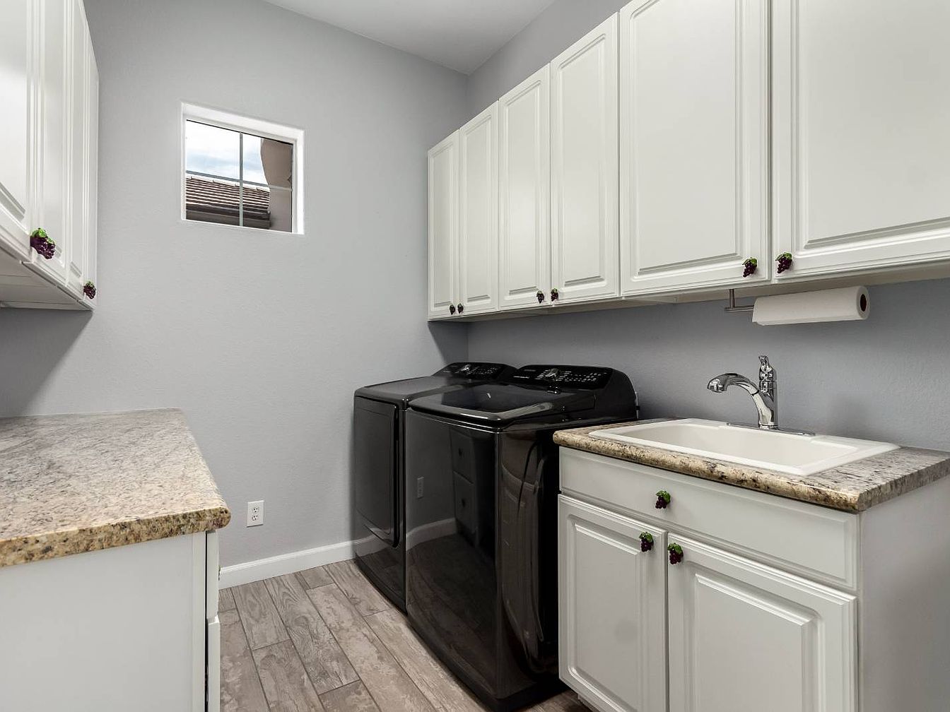 This laundry room offers a clean, modern design with a neutral color palette dominated by soft gray walls and white cabinetry. The cabinetry, featuring classic paneling and accented with unique grape-themed knobs, extends above the sleek black washer and dryer, maximizing storage space. A matching countertop with subtle granite patterns provides ample workspace. The built-in sink with chrome faucet enhances functionality, while a small window brings natural light into the space. The flooring mimics wood in muted tones, adding warmth and texture to this practical, well-organized utility room.