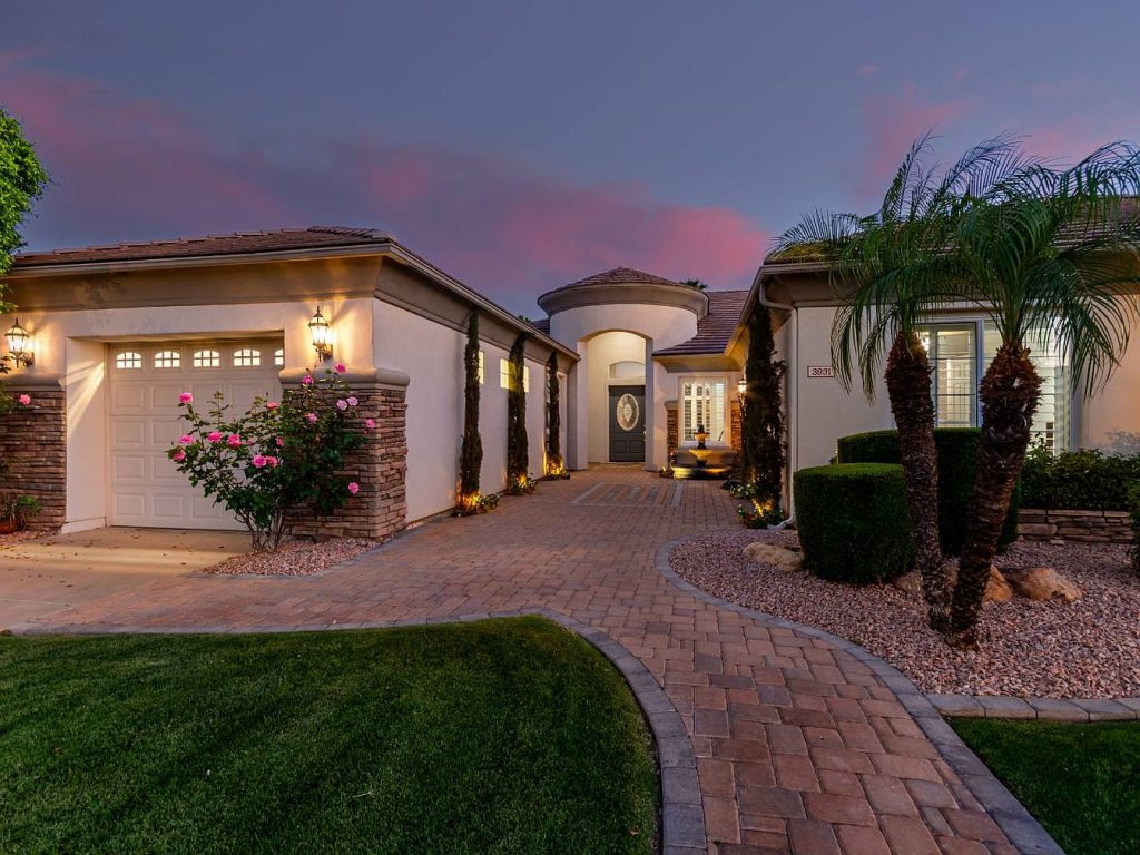 This luxurious residence, located in NE Mesa, Arizona, exemplifies refined living with its elegant architectural style that blends traditional and contemporary design elements. The home boasts impressive curb appeal featuring a serene courtyard, meticulously maintained lush landscaping, and a charming paved walkway leading to an inviting entrance with distinctive rounded tower architecture. The exterior includes stone accents around the garage and soft lighting that enhances the ambiance at dusk. Built with high-end finishes throughout, the home offers a spacious layout comprising 6 bedrooms, including a desirable basement area complete with a large living room, two bedrooms, and a bathroom—perfect for guests or family. Natural light fills the interior, accentuated by plantation shutters and wood-look tile flooring that enrich the atmosphere with warmth and style. The gourmet kitchen is a centerpiece, fully equipped with recessed lighting, granite countertops, a pantry, a center island, a two-tier breakfast bar, and premium stainless steel appliances such as a double wall oven and gas cooktop, catering perfectly to culinary enthusiasts. Additional key features include a three-car garage, an RV gate, and recent landscaping renovations that uphold the estate’s exquisite presentation.