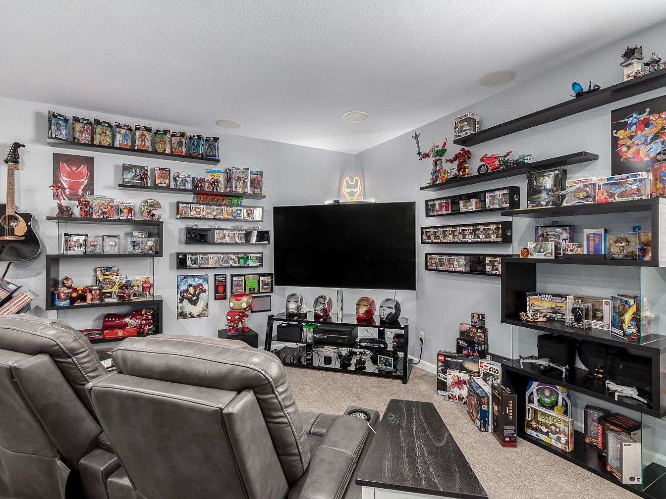 This entertainment space is designed for immersive viewing and personal enjoyment. The focal point is a large wall-mounted flat-screen TV, surrounded by sleek black floating shelves filled with collectibles, action figures, and memorabilia, predominantly Marvel-themed. A black glass media stand below hosts electronic equipment and a striking display of Iron Man helmets. The room features a neutral palette with light gray walls and beige carpeting that lends a cozy atmosphere. Two comfortable gray leather recliners face the TV, inviting relaxation. The carefully curated collectibles add vibrant pops of color and personality, creating a playful yet organized vibe.