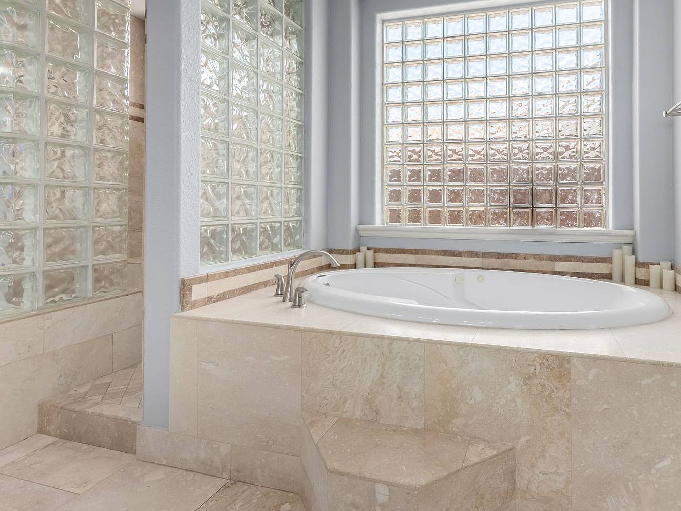 This serene bathroom corner features a spacious soaking tub embedded in a light beige marble surround with matching steps for ease of access. The design incorporates textured glass block walls that allow natural light to diffuse softly while maintaining privacy. Accents of subtle earth tones in the marble tiles complement the pale blue-gray walls, creating a calming palette. The brushed nickel fixtures add a modern touch without overpowering the neutral scheme. Multiple candles placed on the tub ledge enhance the tranquil, spa-like atmosphere, making it an inviting retreat within the home.