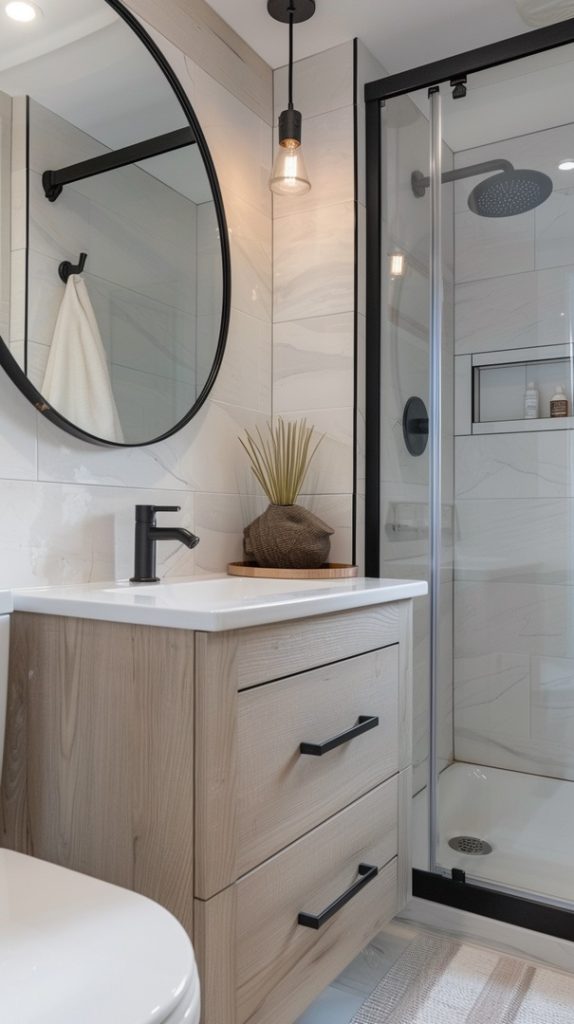 Small spaces can still make a big impact. This compact mid-century modern bathroom maximizes every inch with sleek fixtures and clever storage solutions. The clean lines and minimalistic approach create a sense of openness, making the space feel larger than it is.