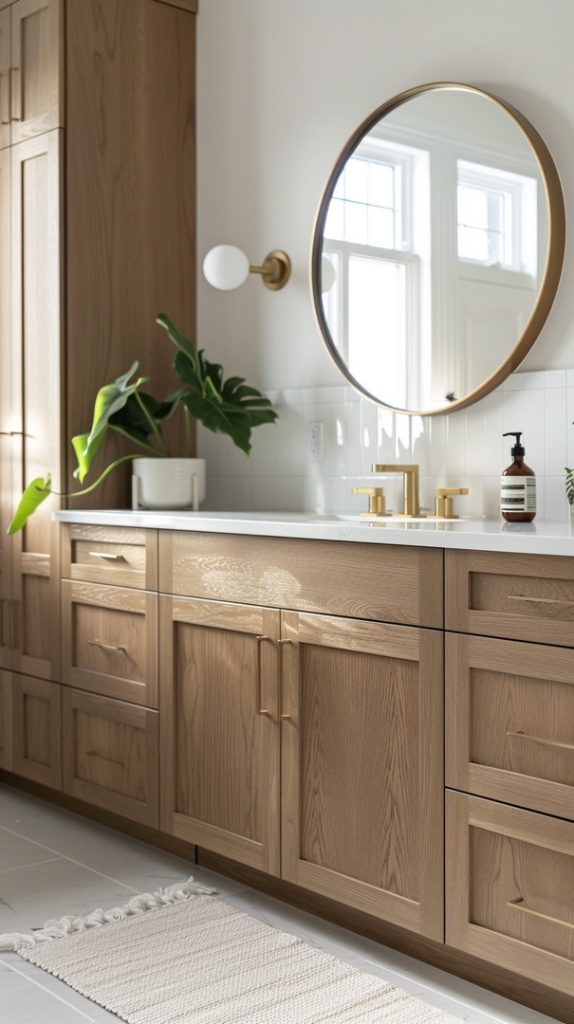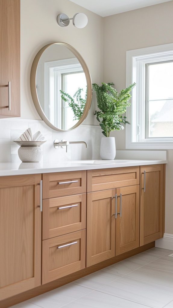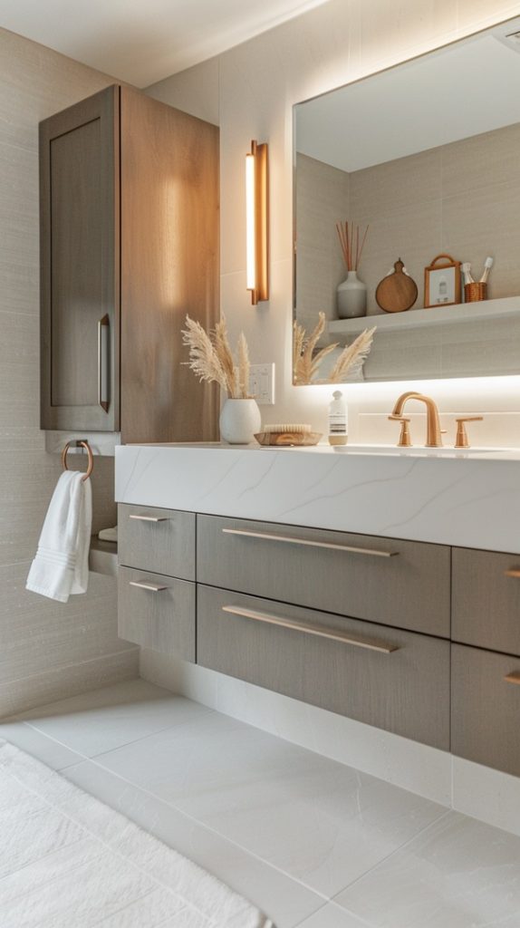 A minimalist vanity with clean lines and simple hardware exemplifies mid-century modern principles. The design is functional yet stylish, providing ample storage without overwhelming the space.