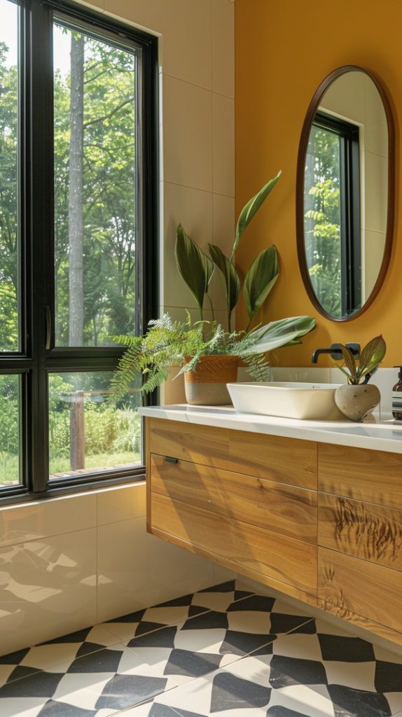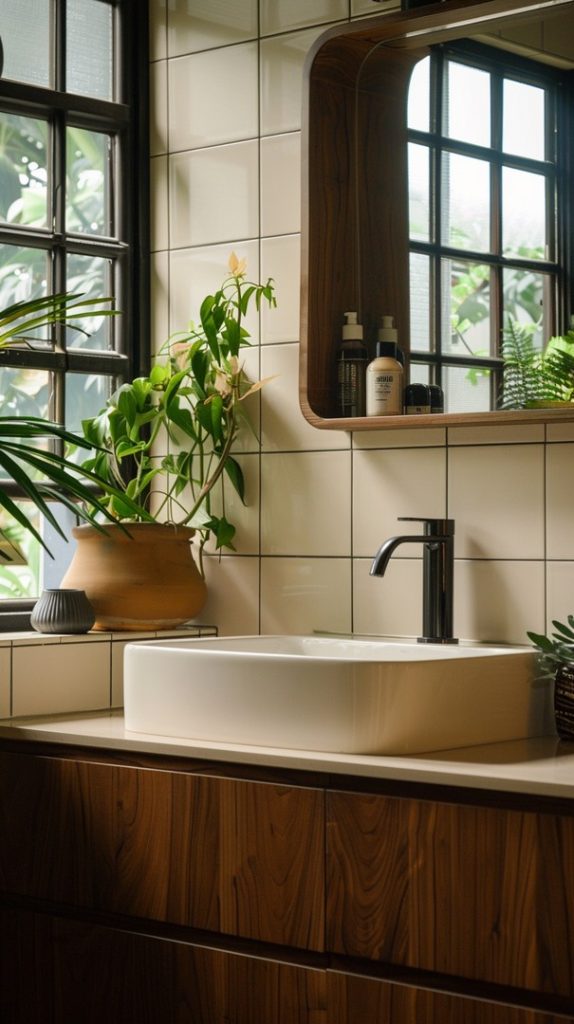 Potted plants add a touch of nature to this mid-century modern bathroom. Species like snake plants and ferns thrive in the humid environment and enhance the natural feel.