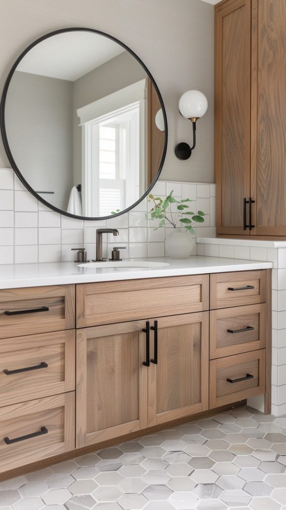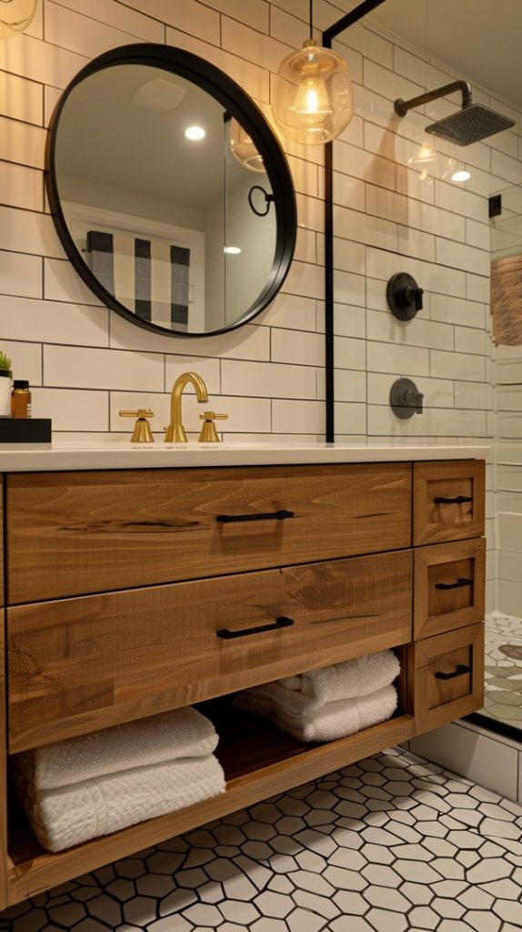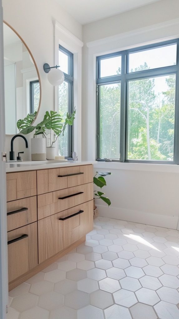 Hexagon tiles make a bold statement in this mid-century modern bathroom. Their geometric pattern is a nod to the era’s fascination with shapes and forms, creating a visually striking and stylish space.