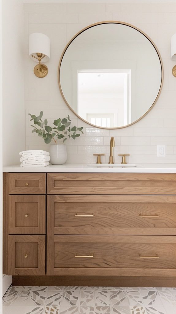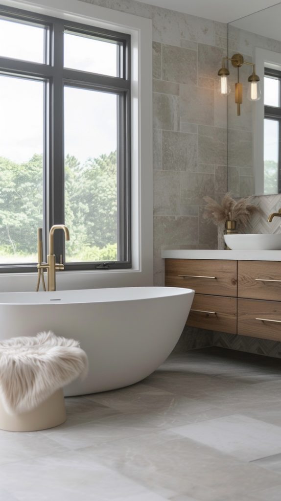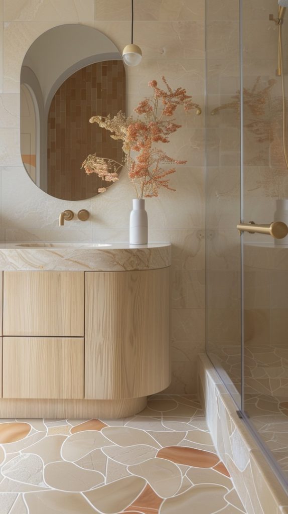 Curved furniture pieces and organic shapes are central to this bathroom’s design. These elements soften the overall look, adding a touch of elegance and fluidity typical of mid-century modern aesthetics.