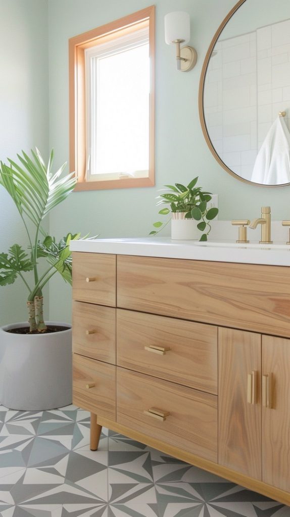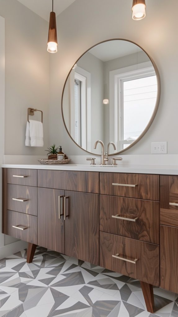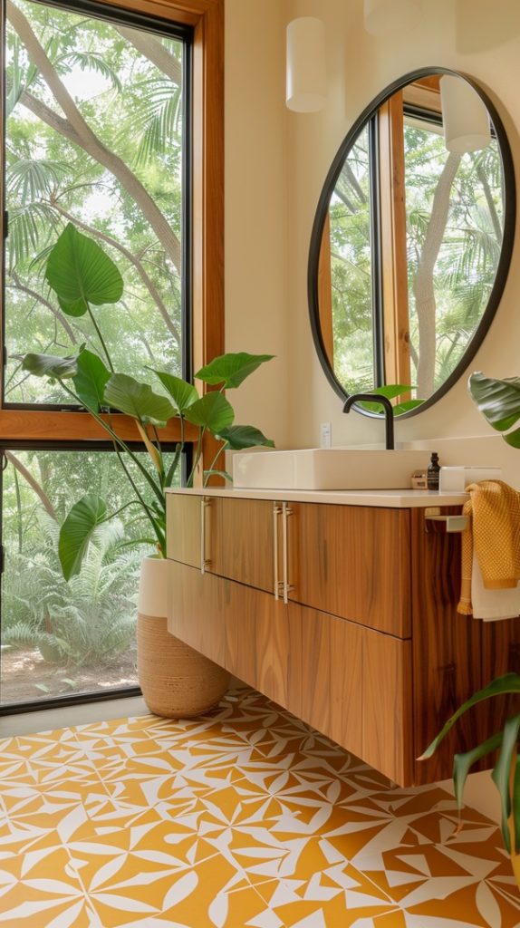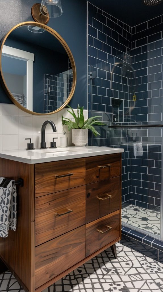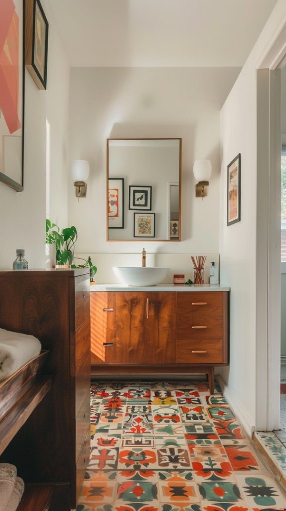 Geometric patterns are a defining feature of mid-century modern design. This bathroom uses patterned tiles to create a dynamic and visually engaging space, staying true to the era’s style.