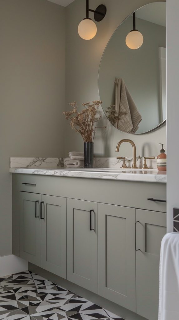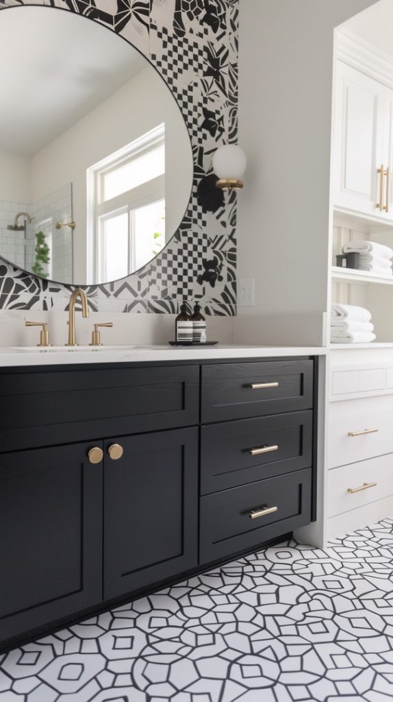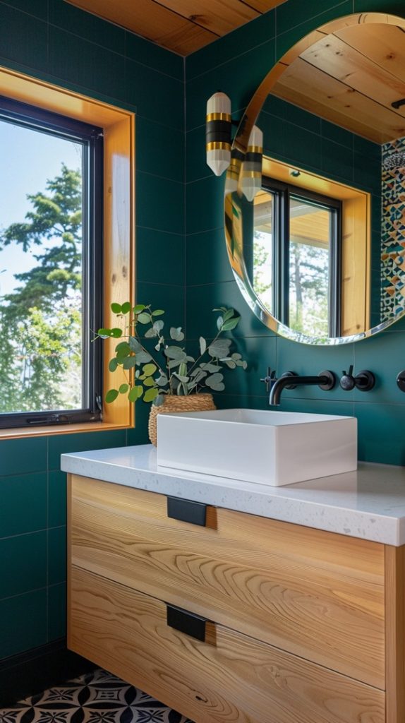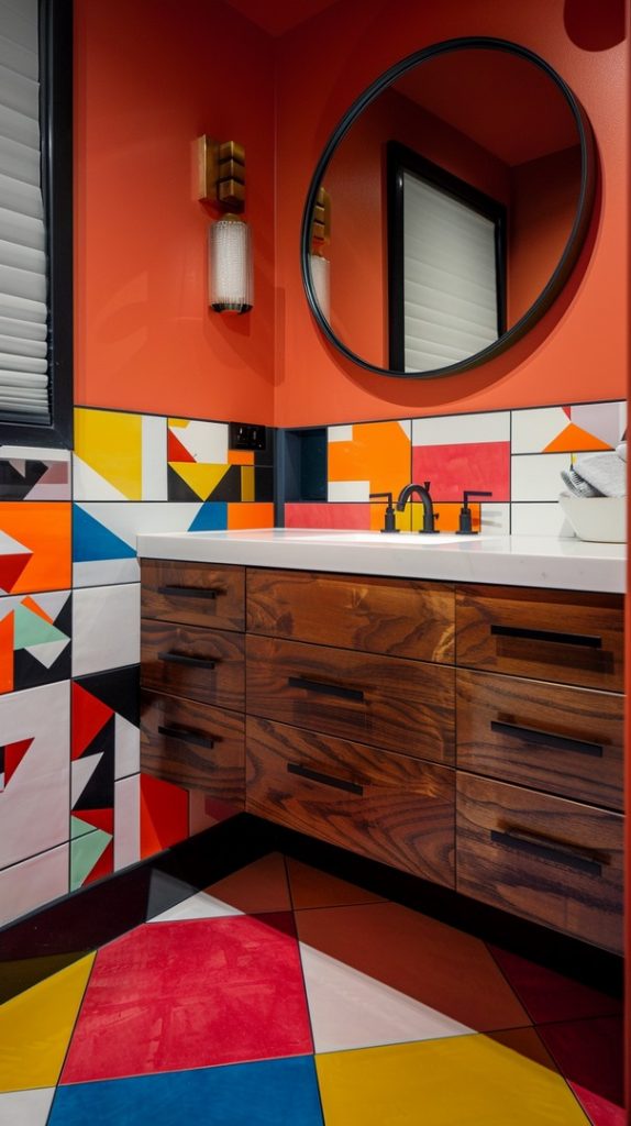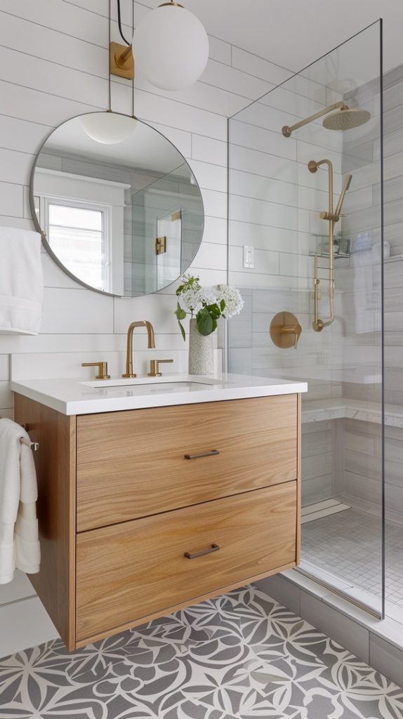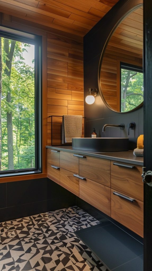Geometric patterns are a defining feature of mid-century modern design. This bathroom uses patterned tiles to create a dynamic and visually engaging space, staying true to the era’s style.