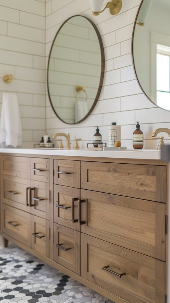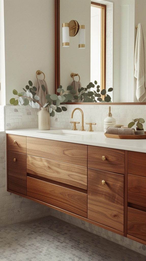 Warm wood accents bring a touch of natural beauty to this mid-century modern bathroom. Elements like wooden vanities and shelving add warmth and texture.