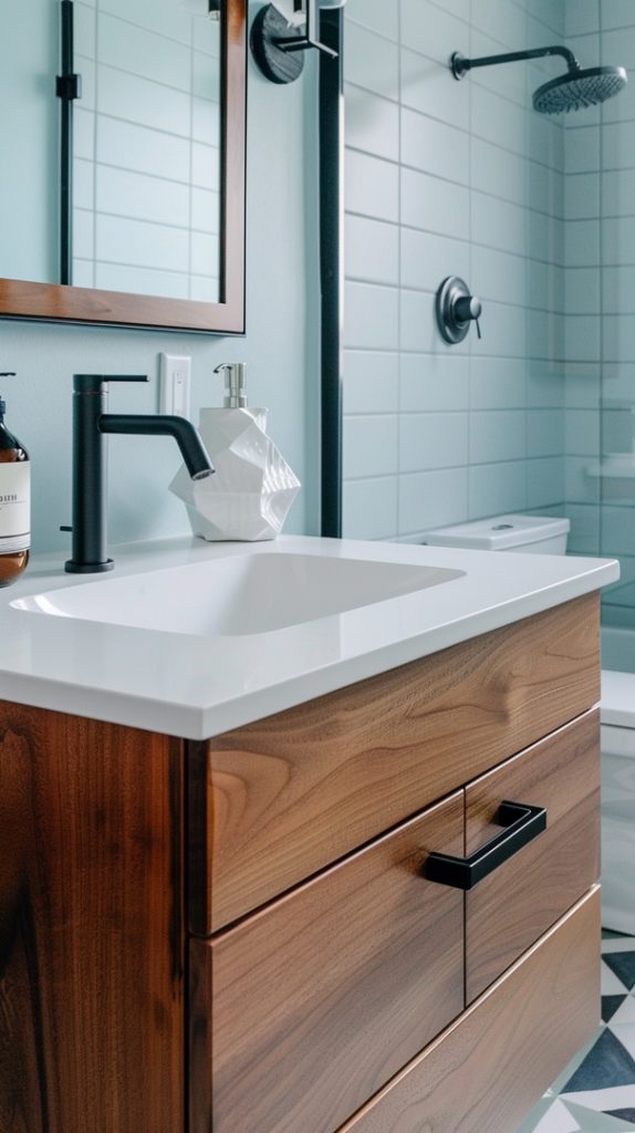 Matte black hardware adds a contemporary edge to this mid-century modern bathroom. The contrast between the black fixtures and lighter elements enhances the overall design.