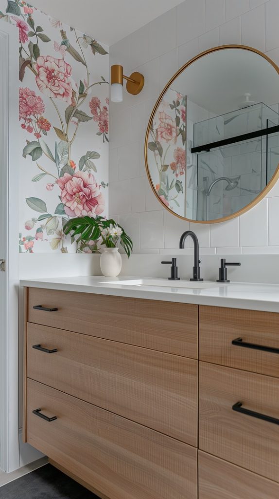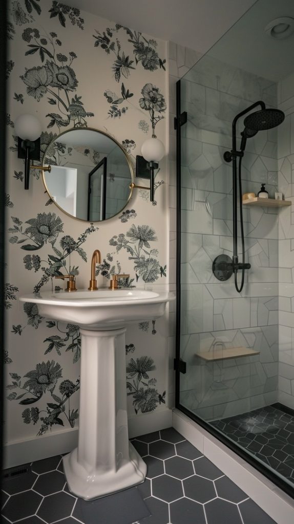 This bathroom features a chic floral wallpaper, a gold-framed round mirror, and a white vanity with brass accents. The black clawfoot tub adds vintage charm, complemented by white subway tiles and a black-and-white hexagonal tile floor. Fresh flowers and neatly arranged toiletries enhance the serene ambiance