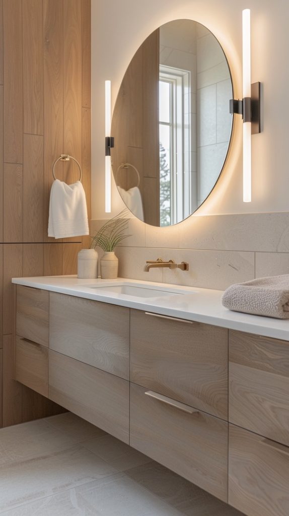 Unique light fixtures are essential in creating the right ambiance. This mid-century modern bathroom features fixtures that are both functional and stylish, illuminating the space beautifully.
