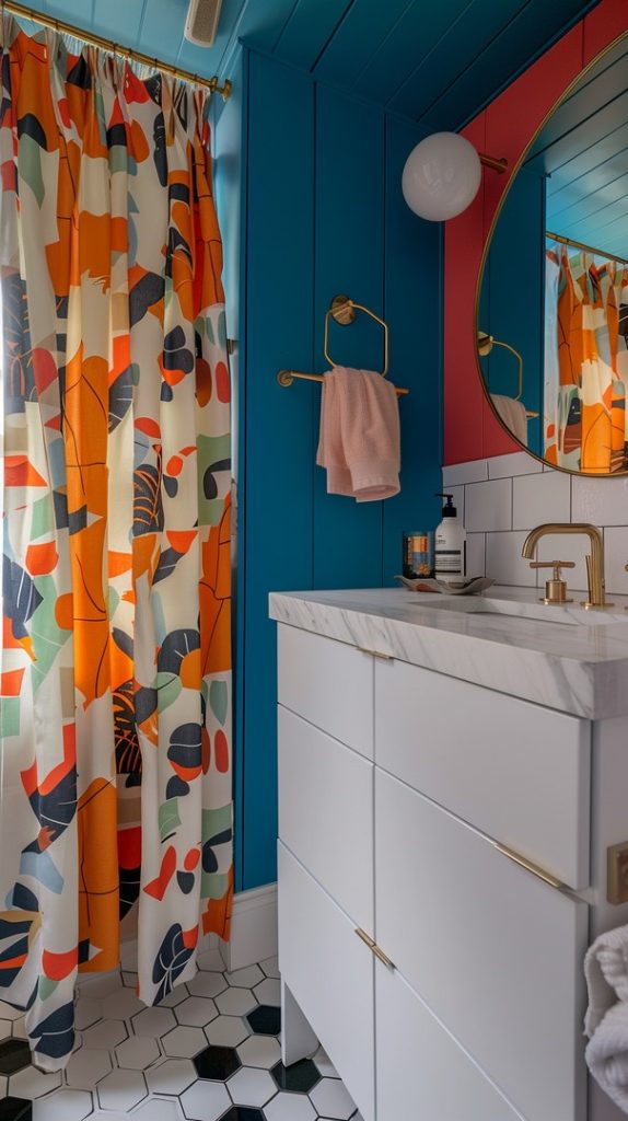 Retro-inspired shower curtains featuring bold patterns and colors add a playful touch to this mid-century modern bathroom, reflecting the era’s love for fun and vibrant design.