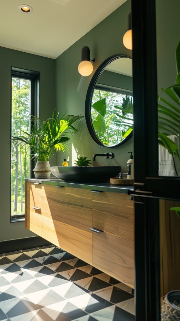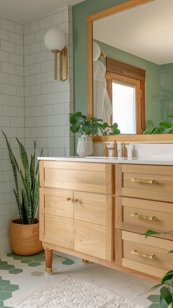 Green tones breathe life into this mid-century modern bathroom. The use of green tiles and plants adds a refreshing, natural element that complements the clean, functional design of the era.