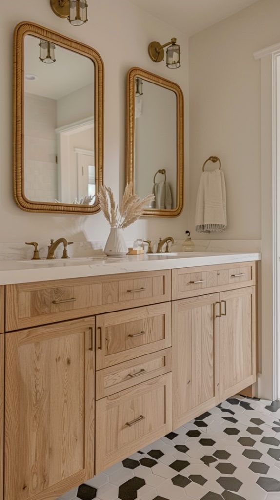 Rattan mirrors bring a touch of natural texture to this mid-century modern bathroom. Their organic feel contrasts nicely with the sleek fixtures.