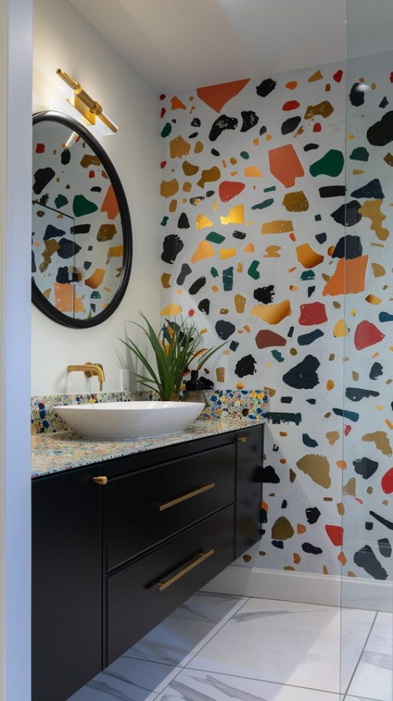 Terrazzo tiles, a hallmark of mid-century design, receive a contemporary twist in this bathroom. The speckled pattern adds texture and depth, while modern fixtures ensure the space feels fresh and updated.