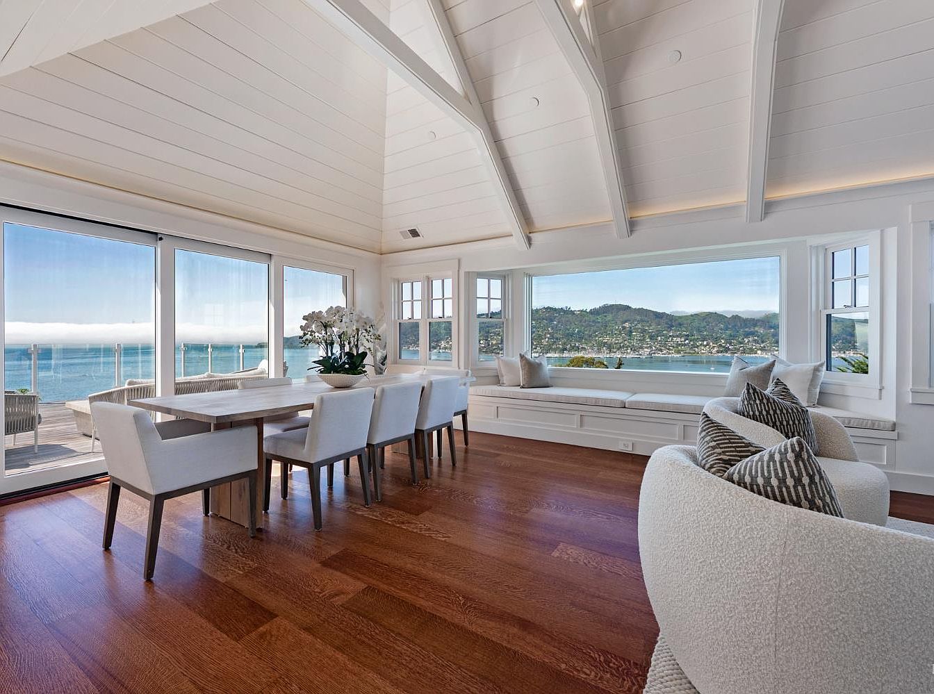 This dining area highlights a vaulted ceiling with exposed white beams that amplify the airy, coastal vibe. The walls and ceiling are clad in white shiplap, enhancing brightness. A large wooden dining table is paired with eight modern, white upholstered chairs. Floor-to-ceiling sliding glass doors open to a balcony overlooking a stunning waterfront. Adjacent is a built-in window seat with neutral cushions and pillows, facing expansive bay windows that offer panoramic views of rolling hills and water. Rich, warm-toned hardwood floors contrast beautifully with the crisp whites, adding warmth and refinement.