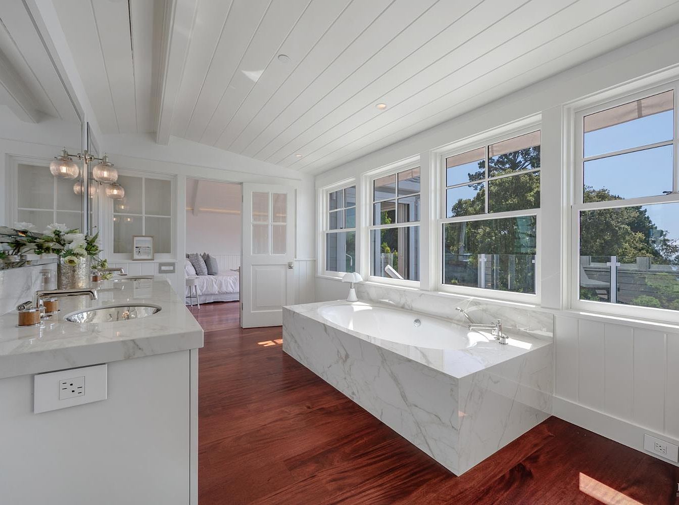 This bright bathroom features a sleek, rectangular marble bathtub positioned along a wall with expansive windows that flood the space with natural light and offer scenic outdoor views. The ceiling has white-painted wood paneling, enhancing the room’s airy and fresh ambiance. The deep wood flooring contrasts beautifully with the predominately white color scheme. A matching marble countertop with an undermount sink complements the bathtub, with modern chrome fixtures adding a subtle shine. Through glass-paneled doors, a glimpse of an adjacent bedroom with a cozy bed dressed in light textiles can be seen, adding to the serene atmosphere.