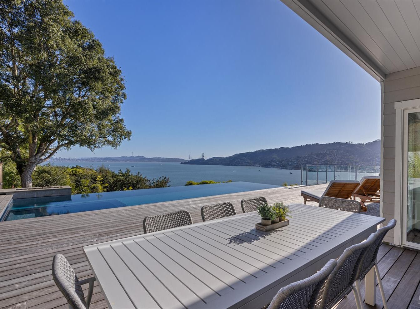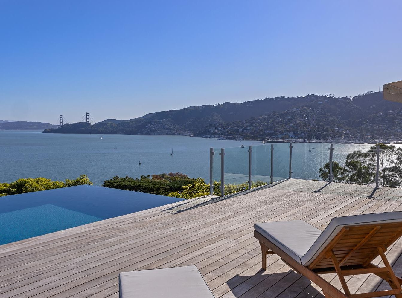 This spacious outdoor deck showcases contemporary design with smooth wooden planks creating a warm and natural flooring surface. An infinity pool seamlessly merges with the horizon, inviting relaxation and enhancing the luxurious vibe. The glass railing ensures unobstructed panoramic views of the deep blue bay, distant green hills, and the iconic Golden Gate Bridge, all under a clear, sunny sky. Comfortable cushioned lounge chairs add a casual elegance, perfect for sunbathing or savoring the serene surroundings. The setup harmonizes modern minimalism with breathtaking nature, highlighting an ideal spot for leisure and entertaining.