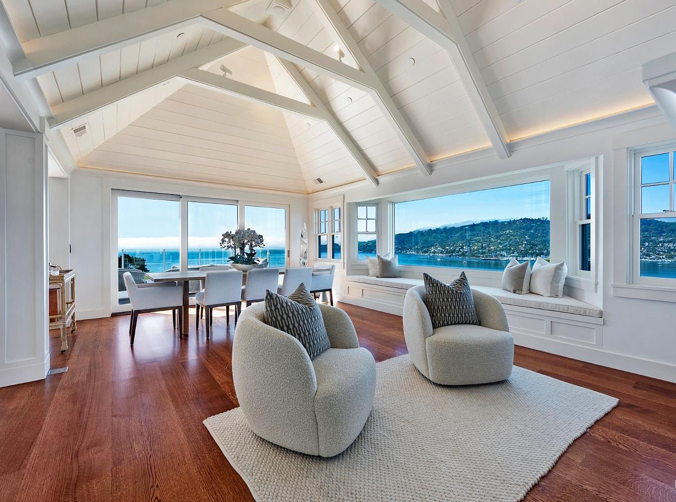 This serene living area offers vaulted white ceilings with exposed beams, creating a spacious and airy ambiance. Warm, polished hardwood floors contrast beautifully with the predominantly white color scheme that includes plush textured armchairs centered on a soft, light-colored rug. The space features a built-in window seat lined with neutral cushions, perfectly framing expansive panoramic windows that provide stunning views of the water and distant hills. A sleek dining table with white upholstered chairs stands near sliding glass doors, inviting abundant natural light and seamless indoor-outdoor flow. The design exudes modern coastal elegance and comfort.