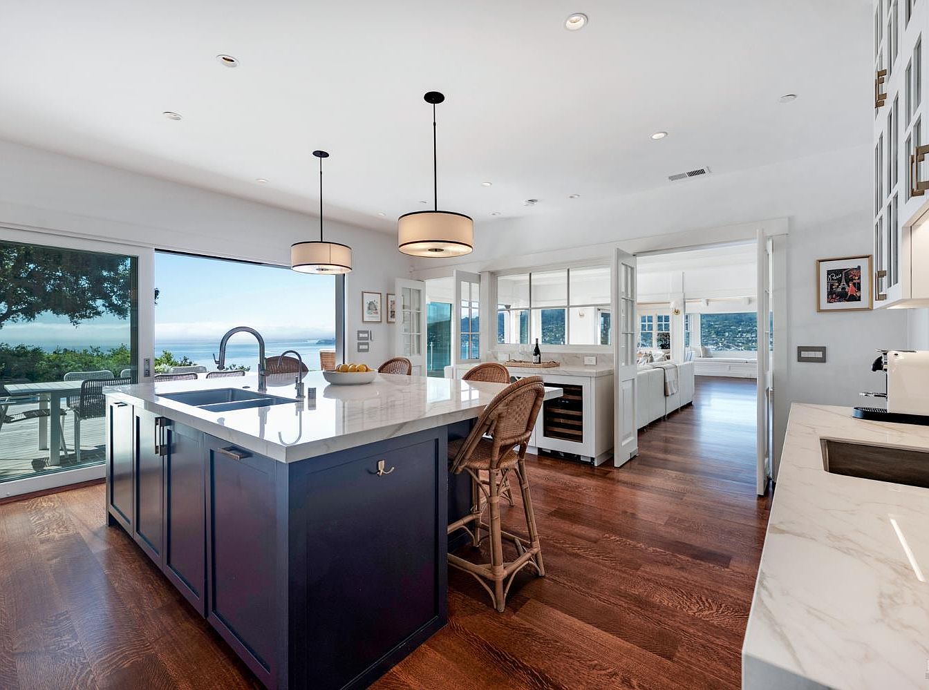This kitchen features a spacious island with a sleek, white marble countertop contrasted by deep navy cabinetry. The island is equipped with a modern dual basin sink and a high-arc faucet, accompanied by four wicker bar stools that offer casual seating. Two round pendant lights hang thoughtfully above, providing ambient lighting. Rich wooden flooring adds warmth and depth to the space. Expansive sliding glass doors open to an outdoor deck with ocean views, inviting natural light and a scenic backdrop. The kitchen flows seamlessly into an adjoining living area through white framed French doors, enhancing openness and connectivity.