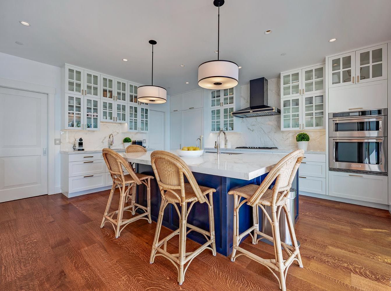 This bright, open kitchen features a large central island with a navy blue base contrasted by a sleek white marble countertop, providing a focal point for both cooking and casual dining. Four natural wicker bar stools with curved backs add warmth and texture, complementing the rich wood flooring. Surrounding the island are white cabinetry units with glass panel doors, highlighting organized dishware and enhancing an airy feel. Stainless steel appliances blend seamlessly with the decor, while two pendant lights with soft white drum shades cast an inviting glow over the cooking area. The overall palette balances modernity and comfort.