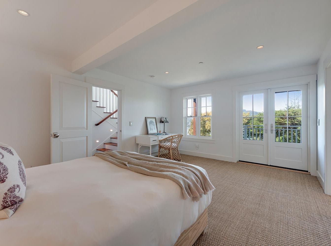 This spacious bedroom showcases a serene and airy atmosphere, enhanced by soft natural light streaming through a pair of French doors leading to a balcony with lush outdoor views. The neutral color palette centers around white walls and beige carpeting, emphasizing simplicity and tranquility. A neatly made bed features white linens and a subtle decorative pillow with a light pattern, complemented by a cozy throw blanket. A small white desk occupies the corner near a double window, paired with a woven chair, creating a peaceful nook for work or reading. Clean architectural lines and recessed lighting contribute to the room’s modern, understated elegance.